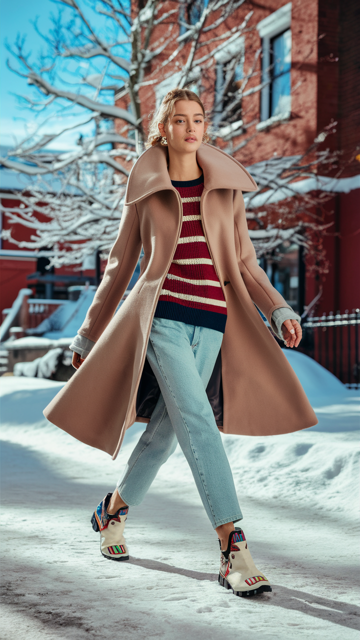 A tailored beige overcoat with wide lapels creates a refined and timeless winter look. Layered over a striped knit sweater and paired with light blue jeans, this outfit is both casual and stylish. White winter boots with colorful accents add a playful yet practical element to this cold-weather ensemble.