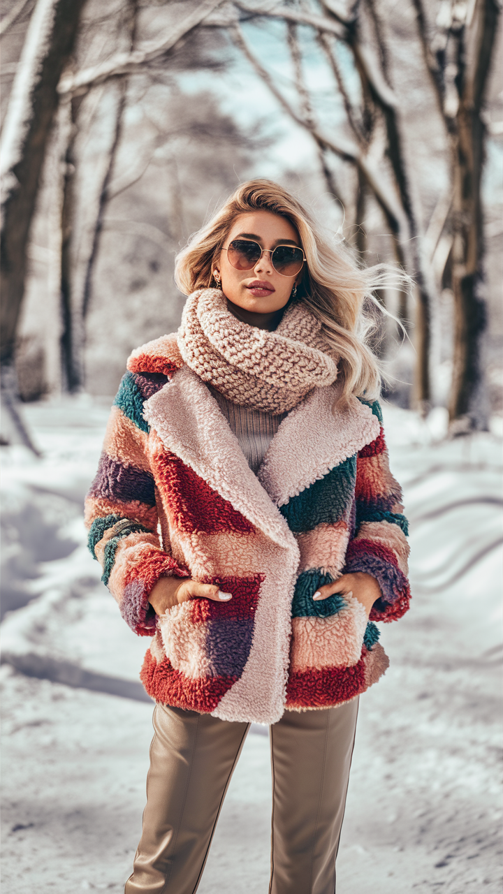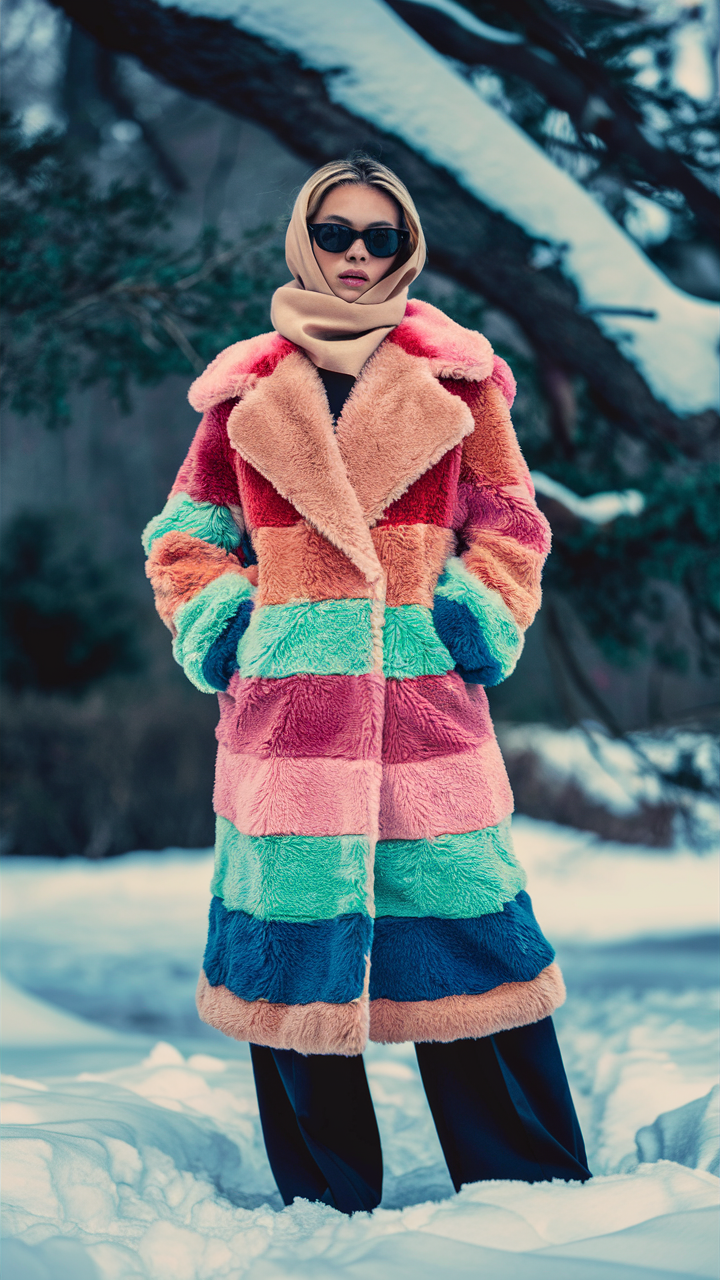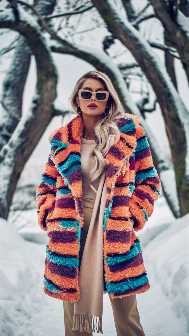 A striped faux fur coat in vibrant orange, blue, and purple tones adds a bold splash of color to winter fashion. Underneath, beige pants and a matching scarf create a neutral base for balance. The ensemble is finished with oversized sunglasses, giving it a glamorous yet practical winter vibe.
