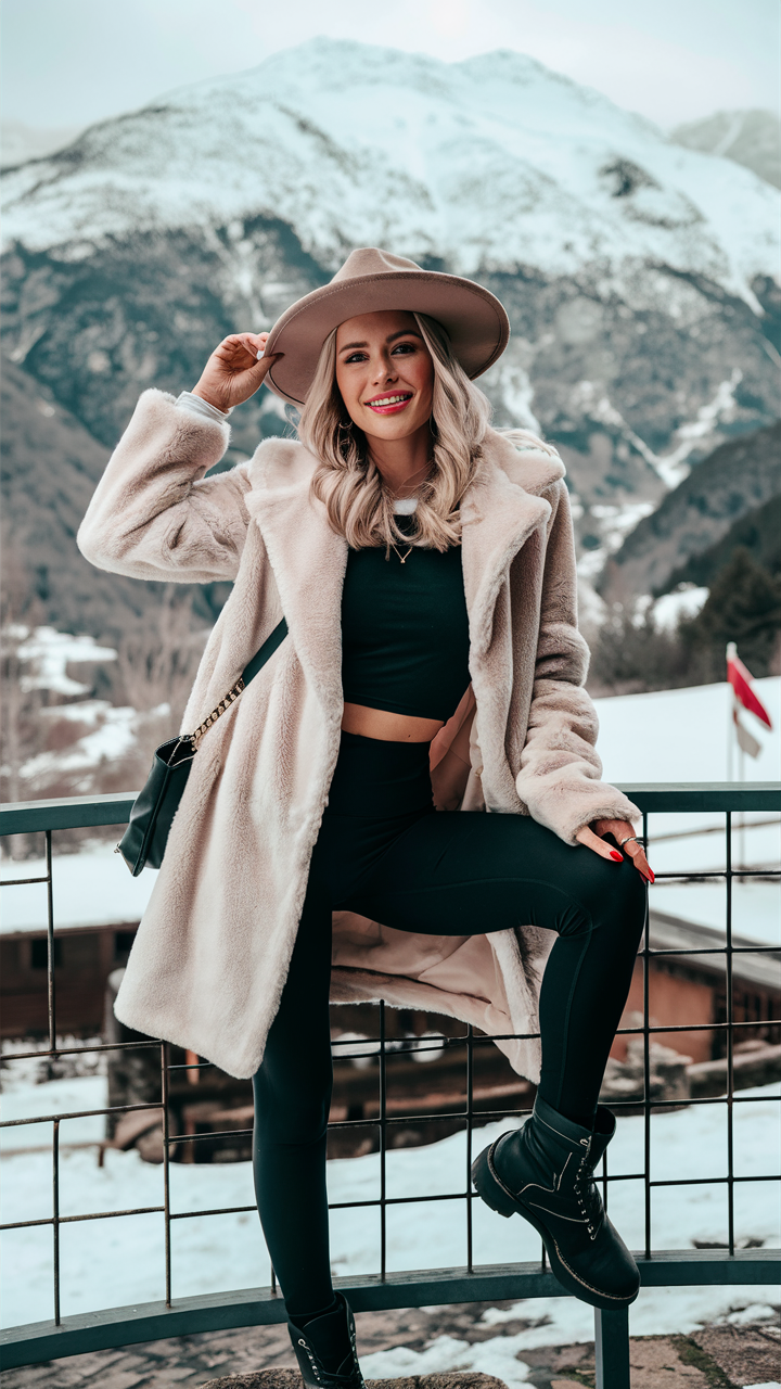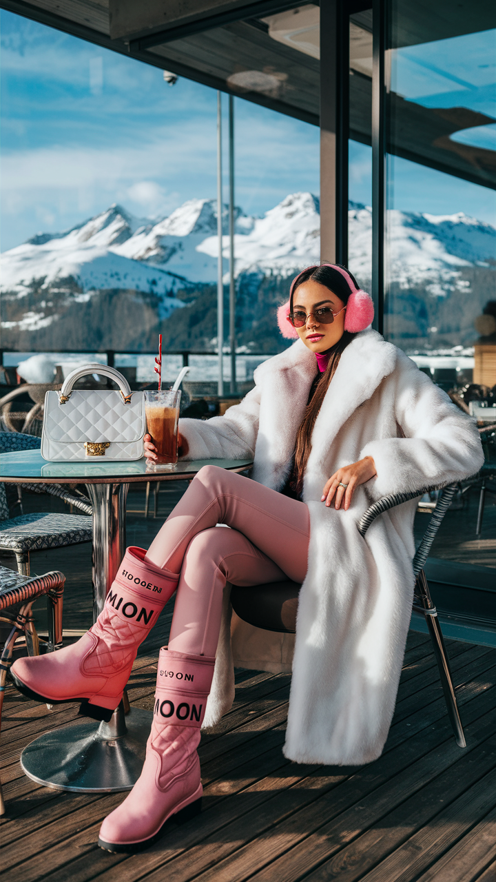 A white faux fur coat paired with pink leggings and moon boots brings a playful yet cozy vibe. Pink earmuffs complete the look, making it both cute and functional for cold weather. This outfit is a trendy choice for casual outdoor gatherings or après-ski fun.