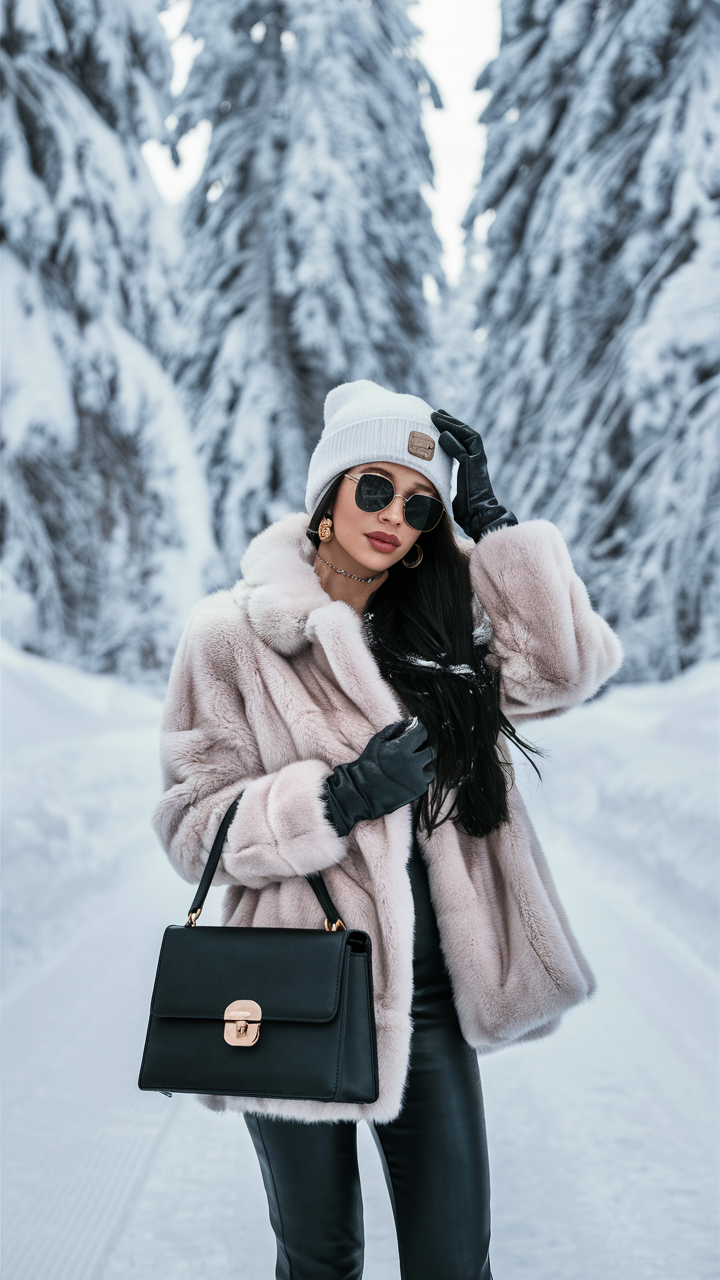 This luxurious white fur jacket is paired with black leather pants for a sharp and sophisticated winter look. Black leather gloves and a structured handbag add sleek details, while a white knit beanie brings warmth and coziness. Sunglasses complete the outfit, offering a balance of elegance and practicality.