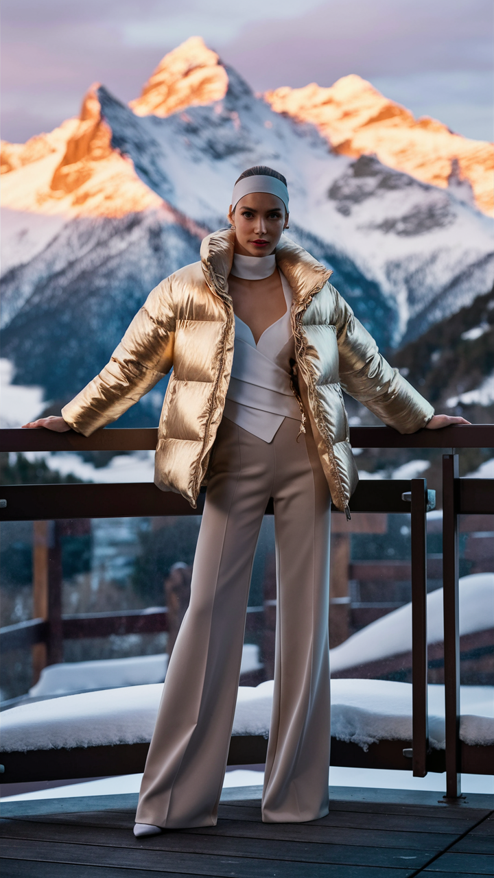 A metallic gold puffer jacket makes a bold statement, paired with tailored cream trousers for a sophisticated winter ensemble. The white layered top and matching scarf add elegance while maintaining warmth. This outfit is perfect for those seeking a luxurious yet practical cold-weather look.