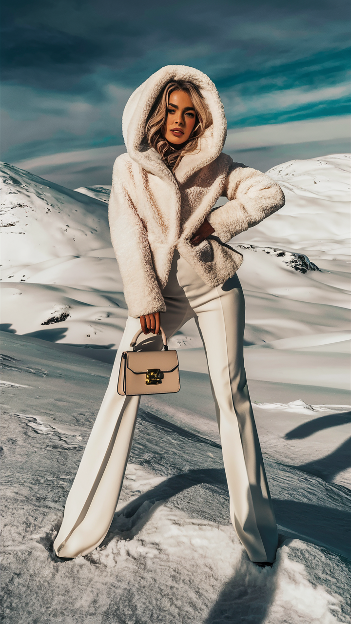 A cozy white fleece jacket with a hood is styled with cream wide-leg trousers for a minimal yet chic winter look. A structured cream handbag adds a touch of elegance, balancing the casual feel of the outerwear. This ensemble is ideal for snowy outdoor adventures with a refined twist.
