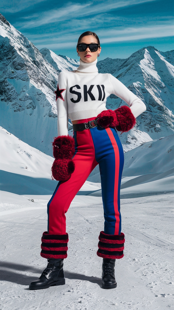 A white turtleneck sweater with bold “Ski” lettering and a red star detail pairs perfectly with vibrant red-and-blue striped pants. Fluffy red mittens and cuffs add warmth and a playful texture to the outfit. Black combat boots complete the sporty and stylish winter look, ideal for ski slopes or après-ski activities.