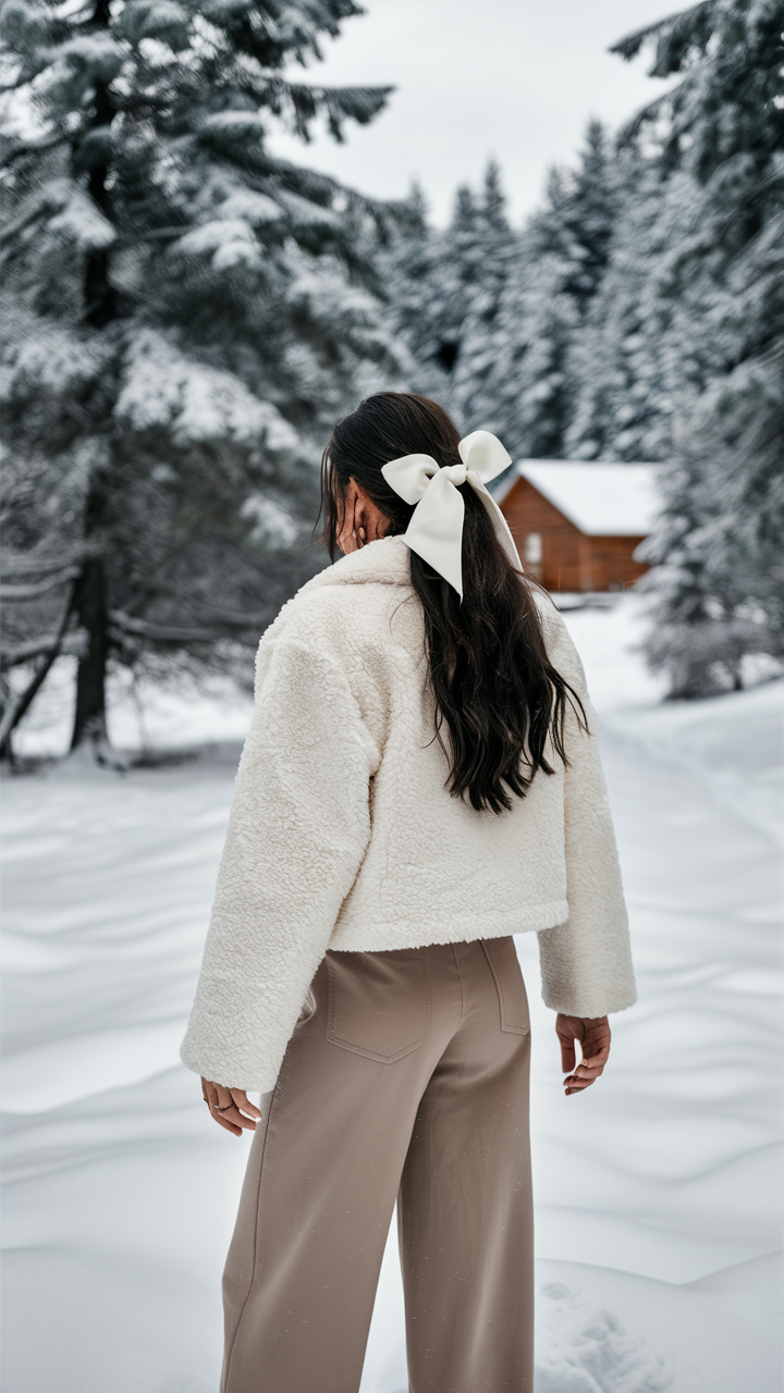 This cropped white fleece jacket offers a cozy and stylish silhouette. It’s paired with tailored beige trousers for a neutral, minimalist winter look. A large white bow adds a soft, feminine touch to the overall ensemble.