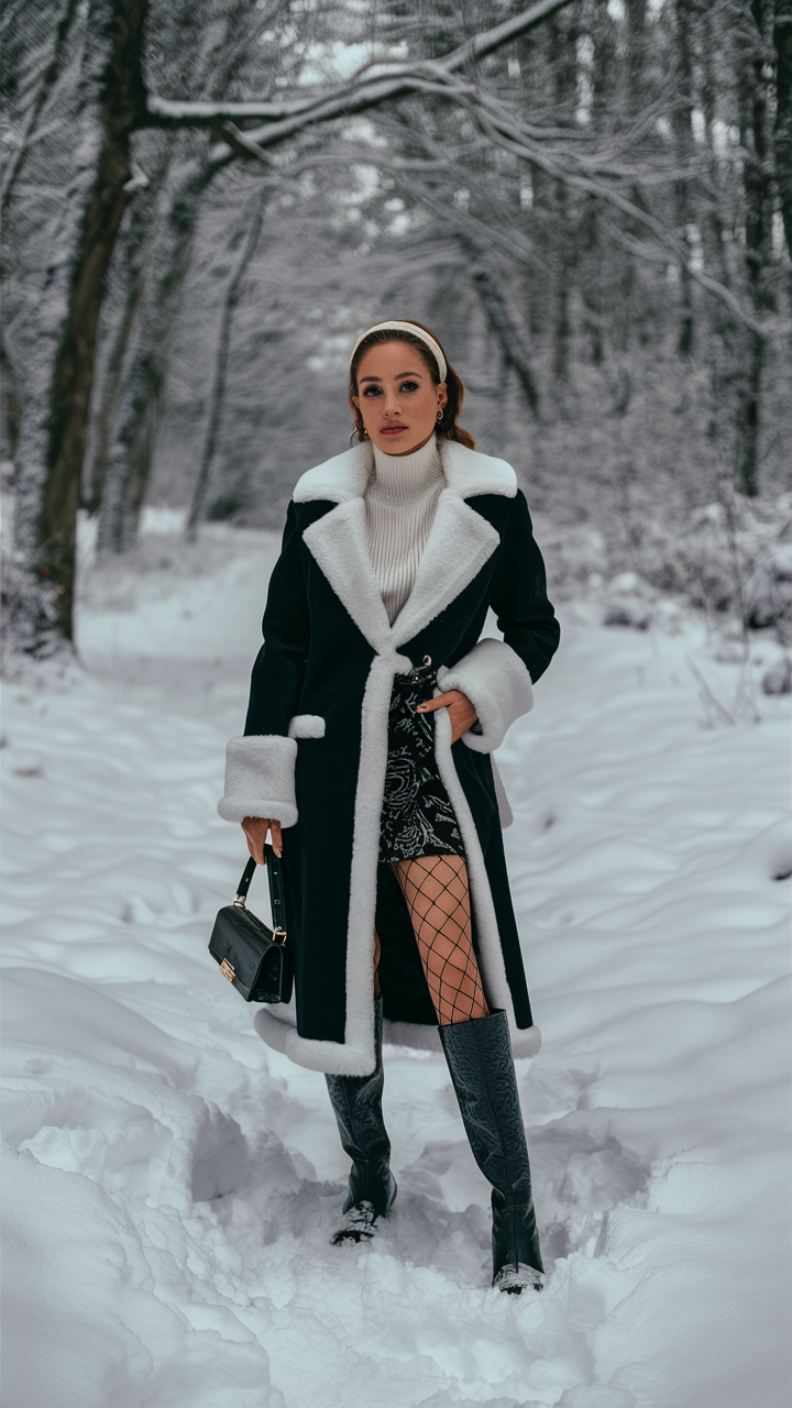 A long black coat with white shearling accents creates a dramatic winter statement. Paired with a patterned mini skirt, fishnet tights, and high boots, the outfit balances elegance and edge. A structured black handbag completes the sophisticated yet bold look.