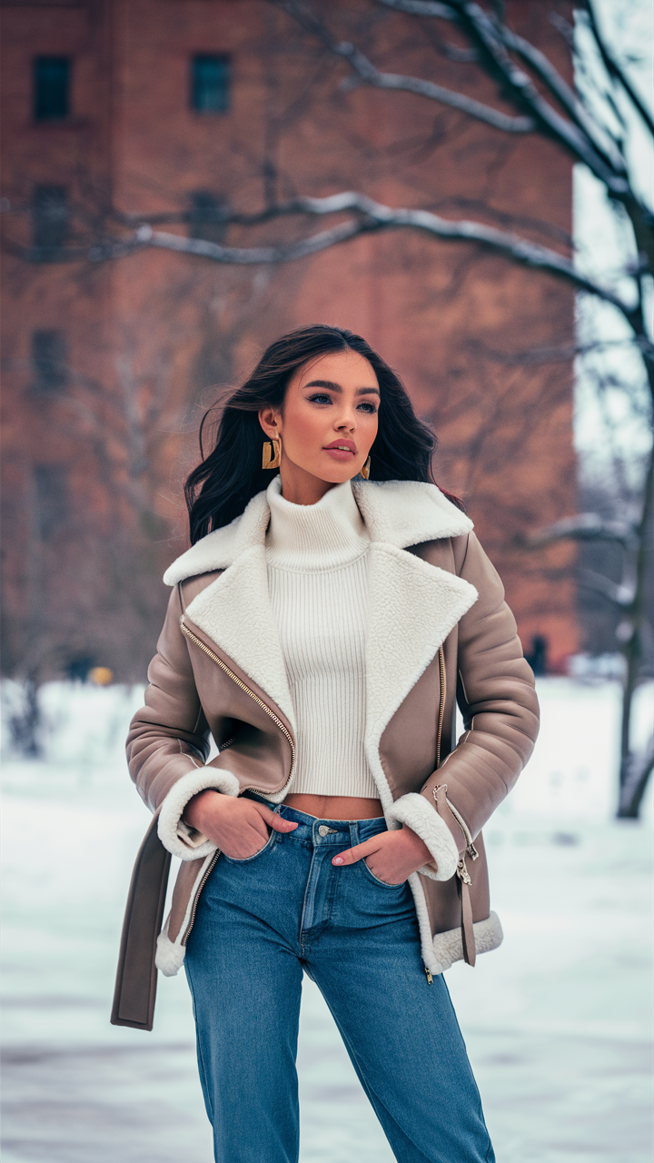 This taupe leather jacket with white shearling lining provides warmth and chic layering. A cropped white turtleneck adds a sleek, modern contrast, paired with casual blue jeans for a relaxed yet polished vibe. Bold gold earrings bring a touch of elegance to this versatile winter outfit.