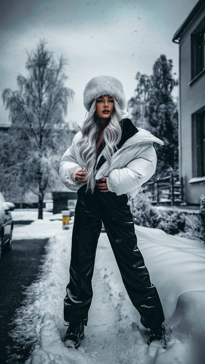 A cropped white puffer jacket is paired with black leather pants for a bold and modern winter look. The addition of a faux fur hat adds warmth and a luxurious touch. Lace-up winter boots finish the outfit, balancing functionality and edgy style.