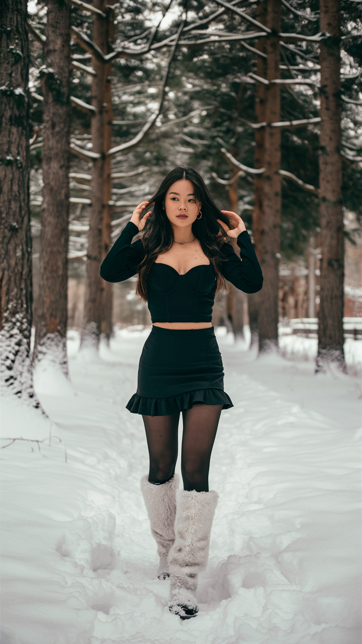 This look features a black ruffled mini skirt paired with a fitted black crop top, perfect for cold weather fashionistas. Sheer tights and tall white faux fur boots add warmth while maintaining a trendy appeal. Gold hoop earrings complete the outfit with a touch of elegance.