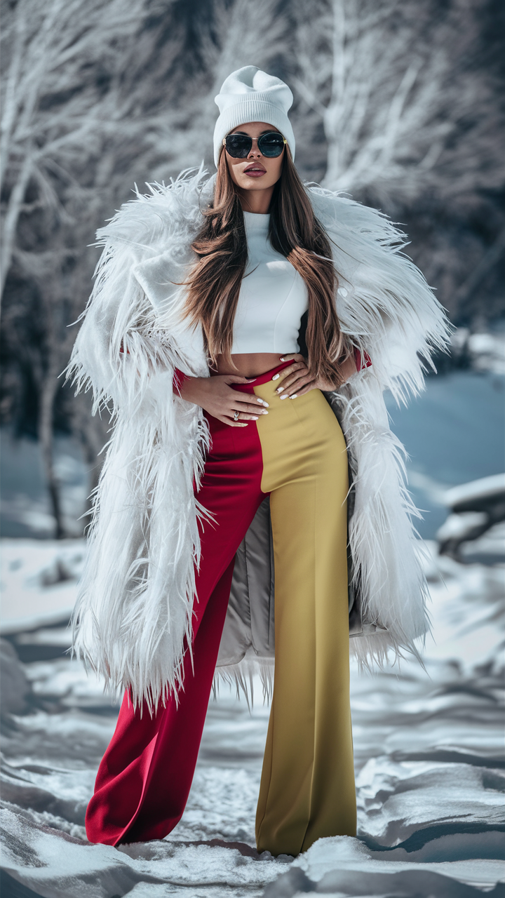 A dramatic white feathered coat pairs effortlessly with vibrant red and yellow colorblock trousers for a statement-making winter outfit. The cropped white top adds a modern edge, while the ensemble is completed with a sleek white beanie and oversized sunglasses. This look balances high-fashion glamour with bold color contrasts for a standout snow outfit.