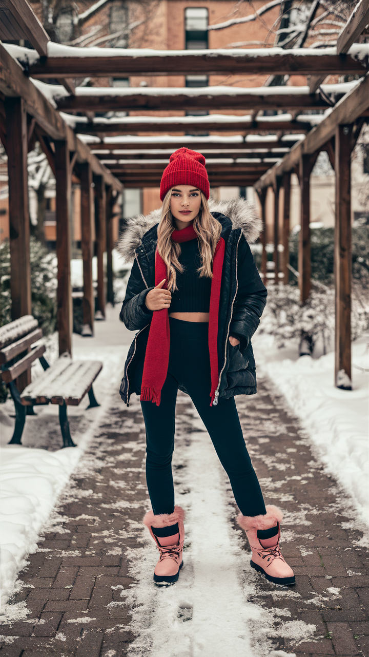 A black parka with fur trim paired with a red knit beanie and scarf creates a striking cold-weather outfit. The addition of pink fur-lined moon boots adds a cute yet practical touch for snowy days. This look is perfect for a casual and cozy winter style.