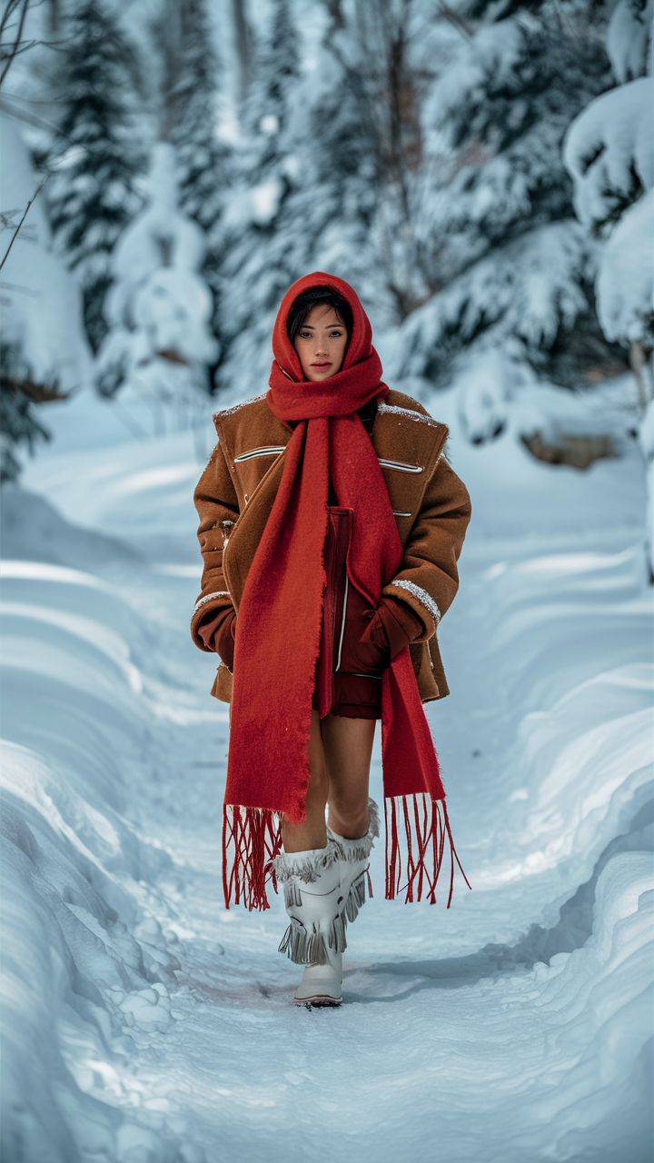 This oversized brown jacket with white accents is paired with a bold red scarf for a pop of color. White fringed snow boots complete the look, combining warmth with a trendy snowboarding style. It’s an elegant yet functional outfit for extreme cold weather.