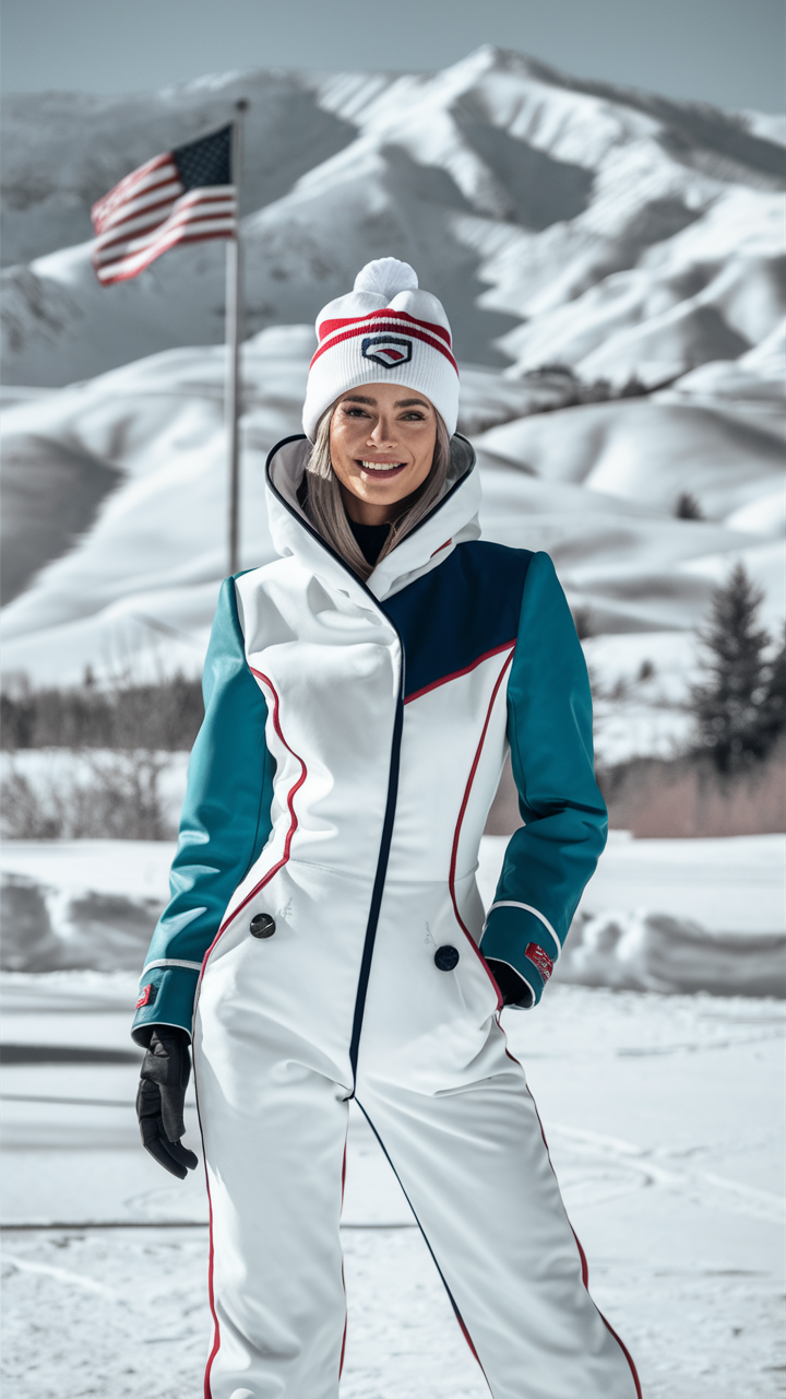This sleek ski suit in white with teal sleeves and red piping offers a sporty yet elegant winter style. A matching white pom-pom beanie adds warmth while keeping the look cohesive and trendy. Black gloves complete the outfit, making it both practical and stylish for snowy adventures.