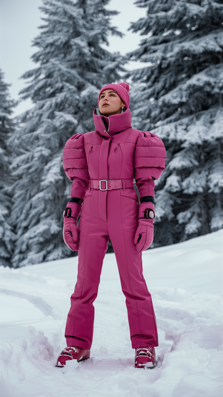 This vibrant pink jumpsuit features puffed sleeves and a belted waist for a bold, fashionable statement. Matching pink gloves and boots add cohesion and warmth, perfect for extreme winter sports. It’s an ideal look for those seeking trendy and functional cold-weather attire.