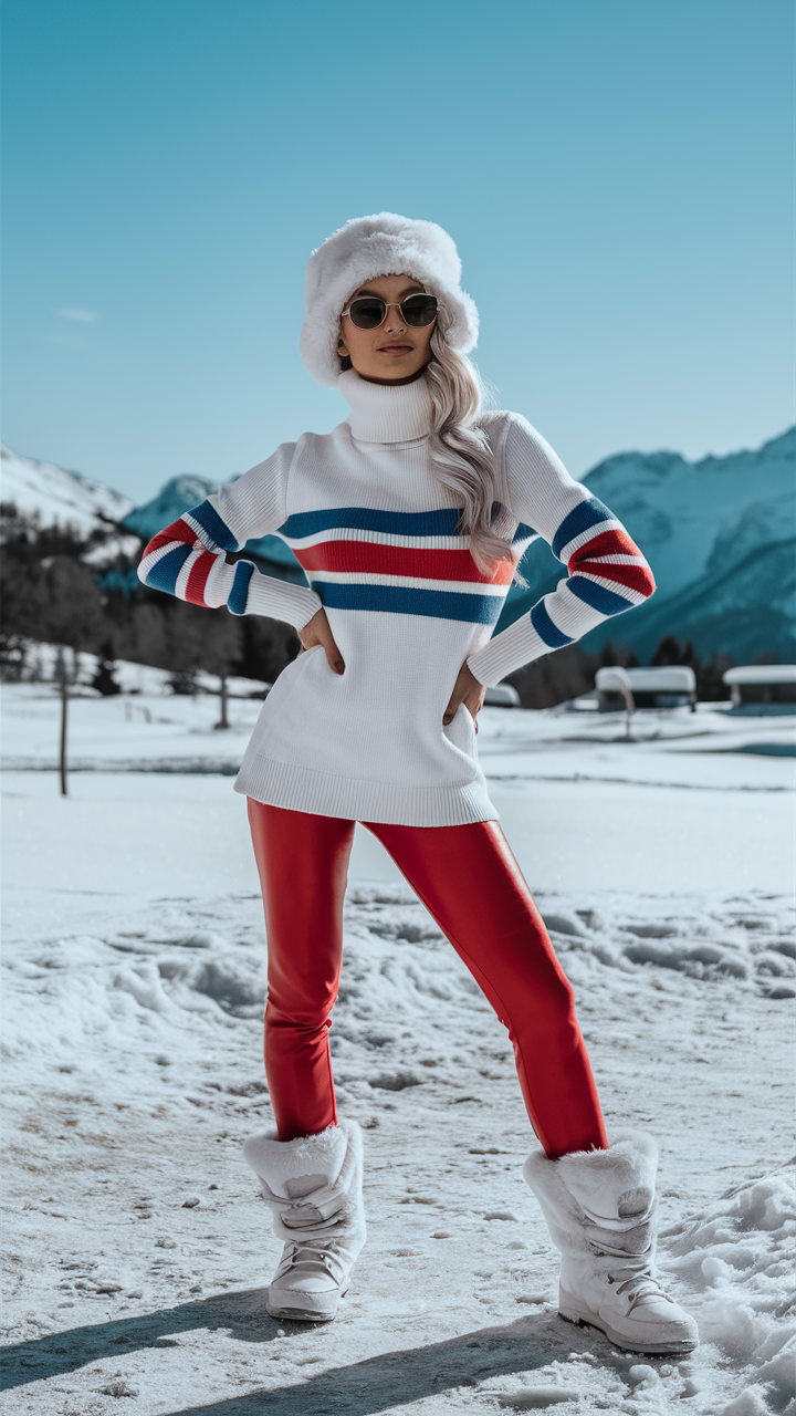 A white knit sweater with bold red and blue stripes creates a sporty and fresh look for winter. Paired with glossy red leggings and white fur-lined snow boots, this outfit balances warmth with standout style. A white faux fur hat adds a cozy and chic finishing touch.