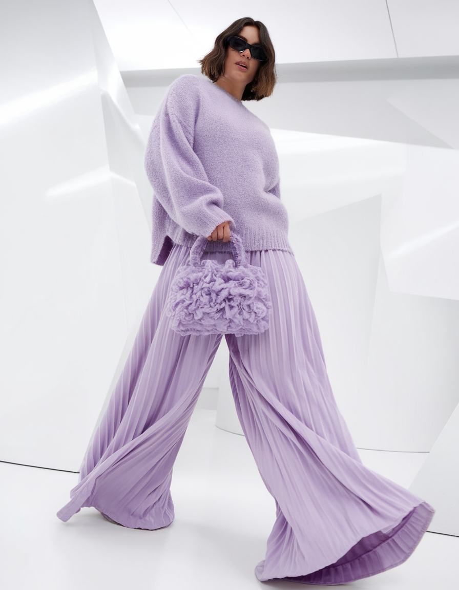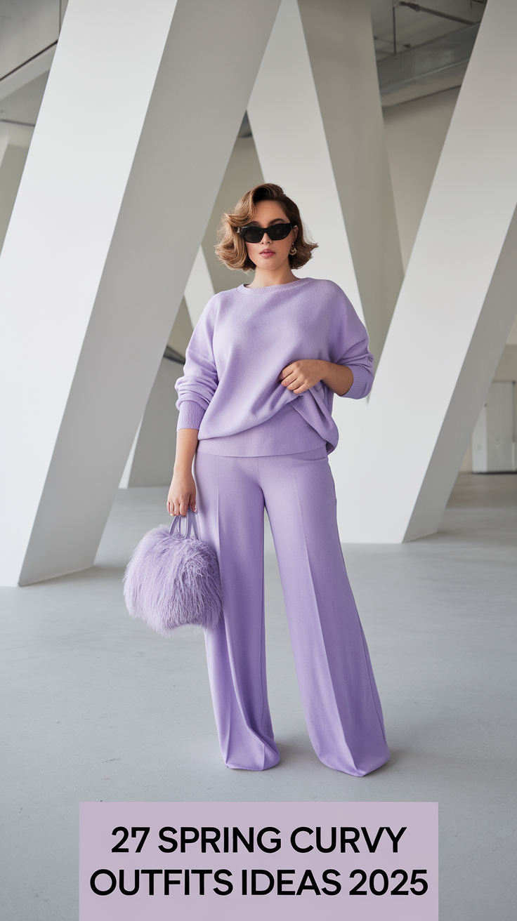 This pastel lavender ensemble features a soft, oversized knit sweater paired with pleated wide-leg palazzo pants for an airy and elegant spring curvy outfits ideas 2025 look. The textured sweater adds volume, while the flowy pants elongate the silhouette, making it flattering for thick women. Completed with a fluffy lavender handbag, this outfit is ideal for graduation or a concert.