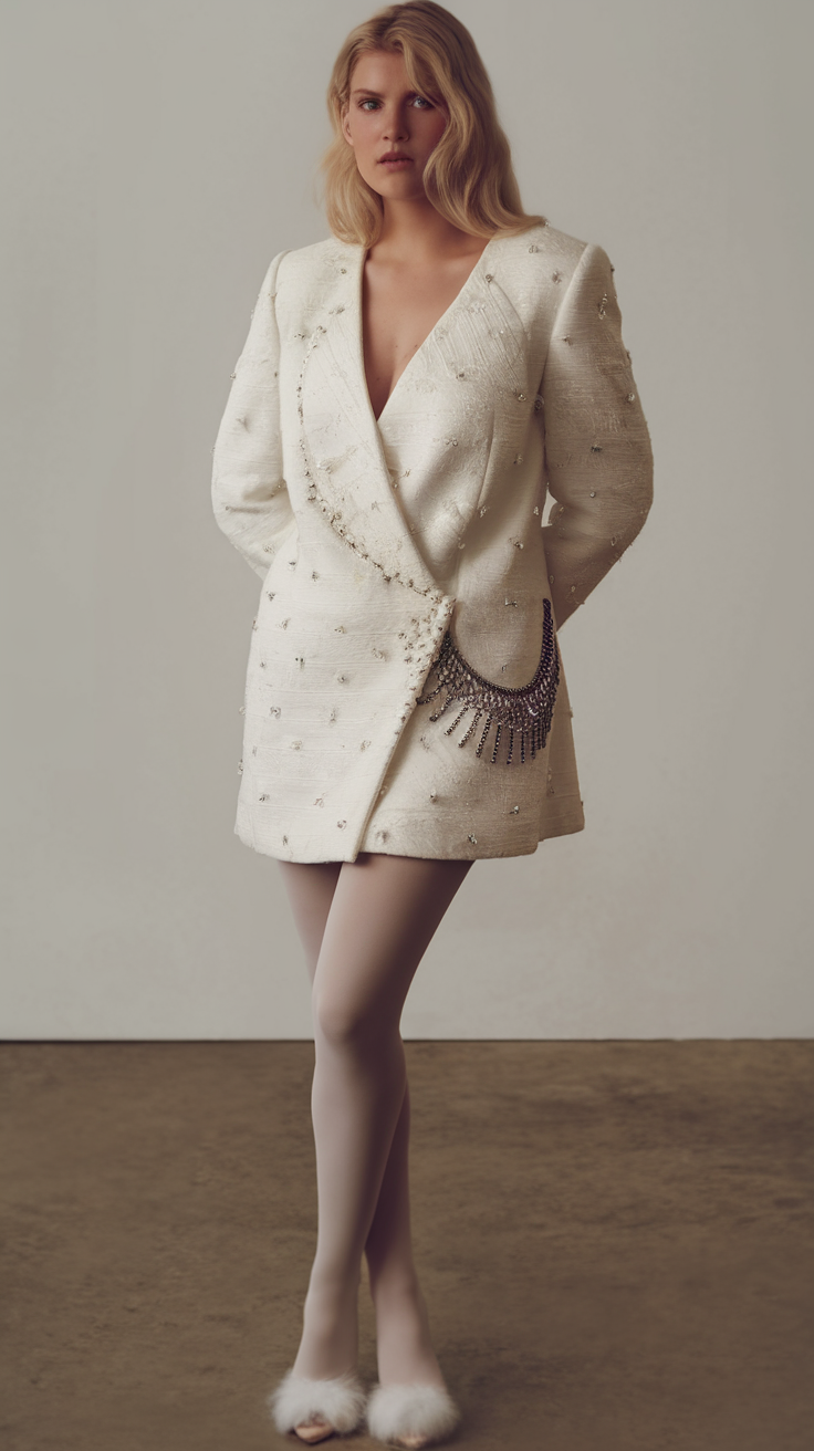 This white blazer dress features intricate embellishments and a wrap design that highlights the waist for a structured yet elegant look. The addition of a delicate chain accent adds a glamorous touch, making it perfect for de outfits formales. Paired with sheer tights and fluffy heels, this outfit is ideal for alt body types in spring fashion.