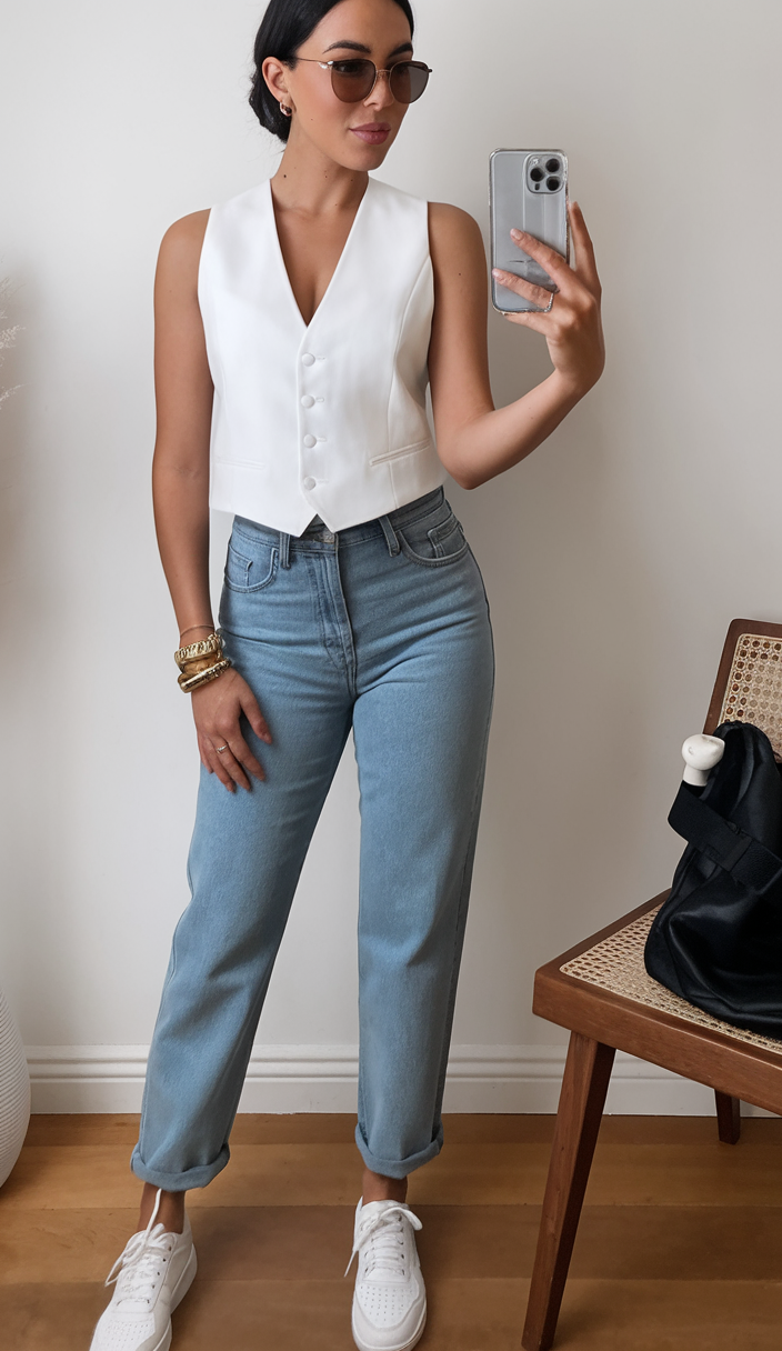 A tailored white cropped vest is paired with light-wash high-waisted jeans, creating a polished yet casual spring curvy outfits ideas 2025 look. The sleek button detailing on the vest complements the simplicity of the rolled-up jeans, ideal for casual street style or a may birthday outing. Styled with white sneakers and gold bangles, this outfit is a great everyday option for petite fashion spring.