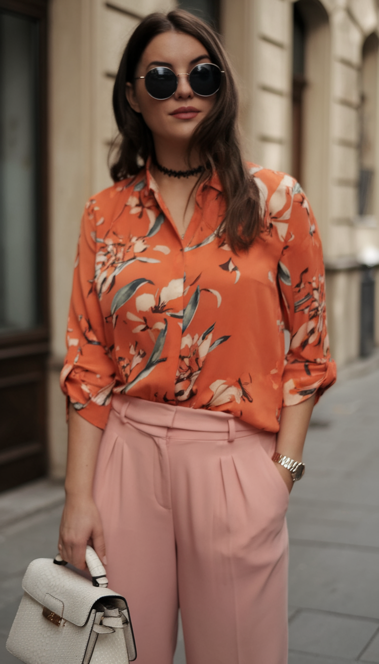 This vibrant outfit pairs a flowy orange blouse with a bold floral print and soft pink tailored trousers. The blouse’s loose fit contrasts perfectly with the structured, pleated pants, creating a balanced and flattering look for body types spring. Accessorized with a white handbag and dark round sunglasses, this ensemble is ideal for casual street style or everyday outings.