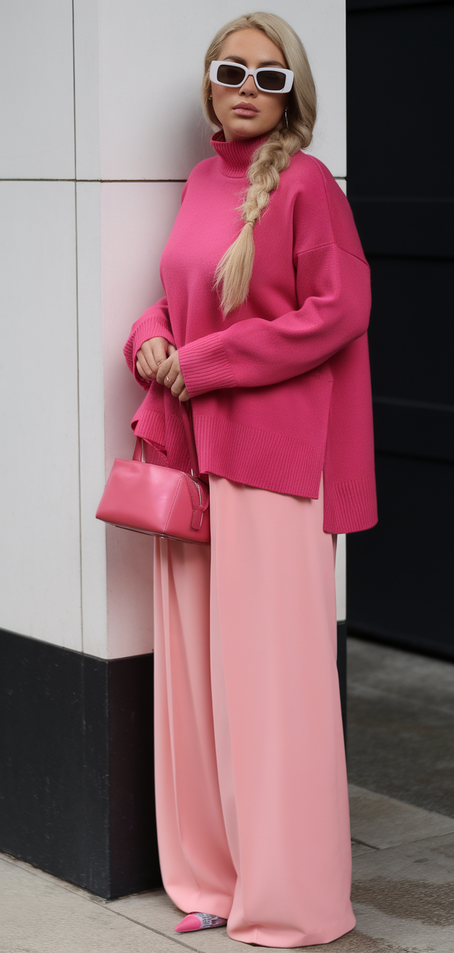 A cozy hot pink oversized sweater is paired with flowing blush-colored wide-leg trousers, creating a bold monochromatic spring fashion look. The sweater’s high neckline and loose fit provide a relaxed vibe, while the pants add sophistication. Styled with matching pink accessories and statement sunglasses, this outfit is perfect for body types baddie and alt body types.