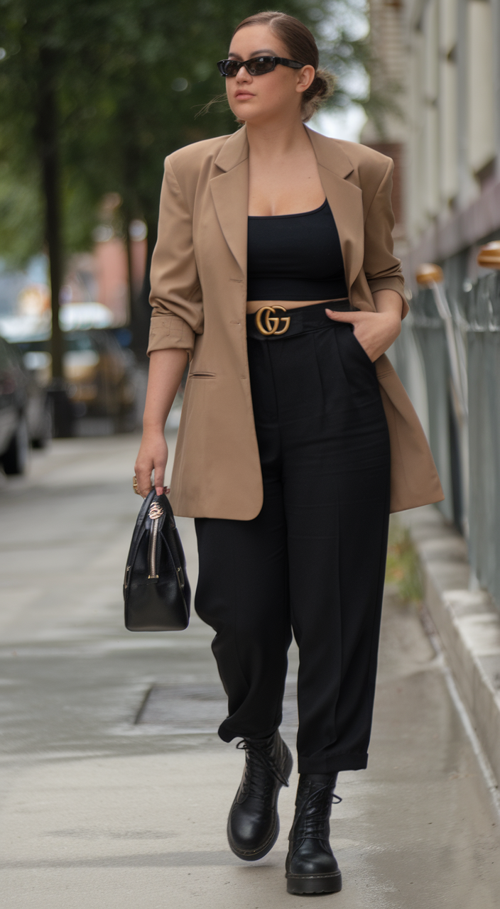 This outfit features a tailored camel blazer paired with a black cropped top and pleated high-waisted black trousers. The gold belt adds a luxe touch, while the combat boots give the ensemble an edgy vibe. Completed with a structured black handbag, this look is ideal for casual street style or a concert.