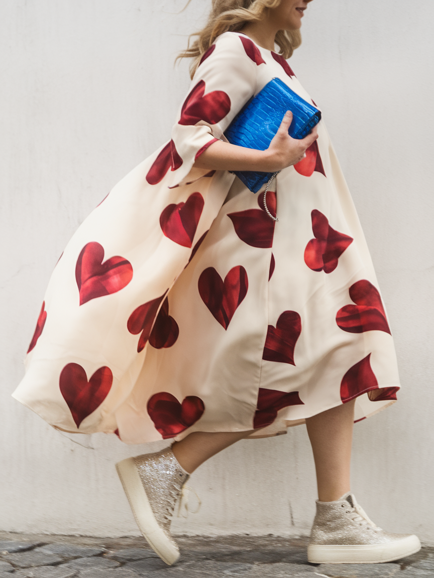 This flowing cream midi dress is adorned with bold red heart prints, offering a playful yet chic spring fashion vibe. Paired with glitter sneakers for a casual touch and a striking blue clutch, it’s a perfect choice for everyday or may birthday celebrations. The loose silhouette makes it flattering for various body types.