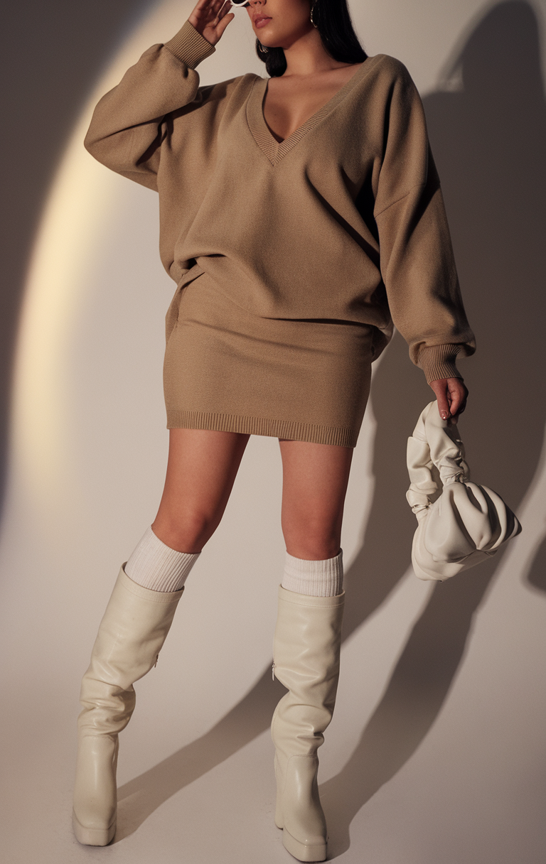 This ensemble features a camel-toned oversized knit sweater paired with a fitted mini skirt, creating a seamless monochromatic look. Styled with knee-high cream boots and matching knit socks, the outfit is cozy yet chic. The ruched white clutch adds a stylish accent, perfect for spring fashion and everyday wear.