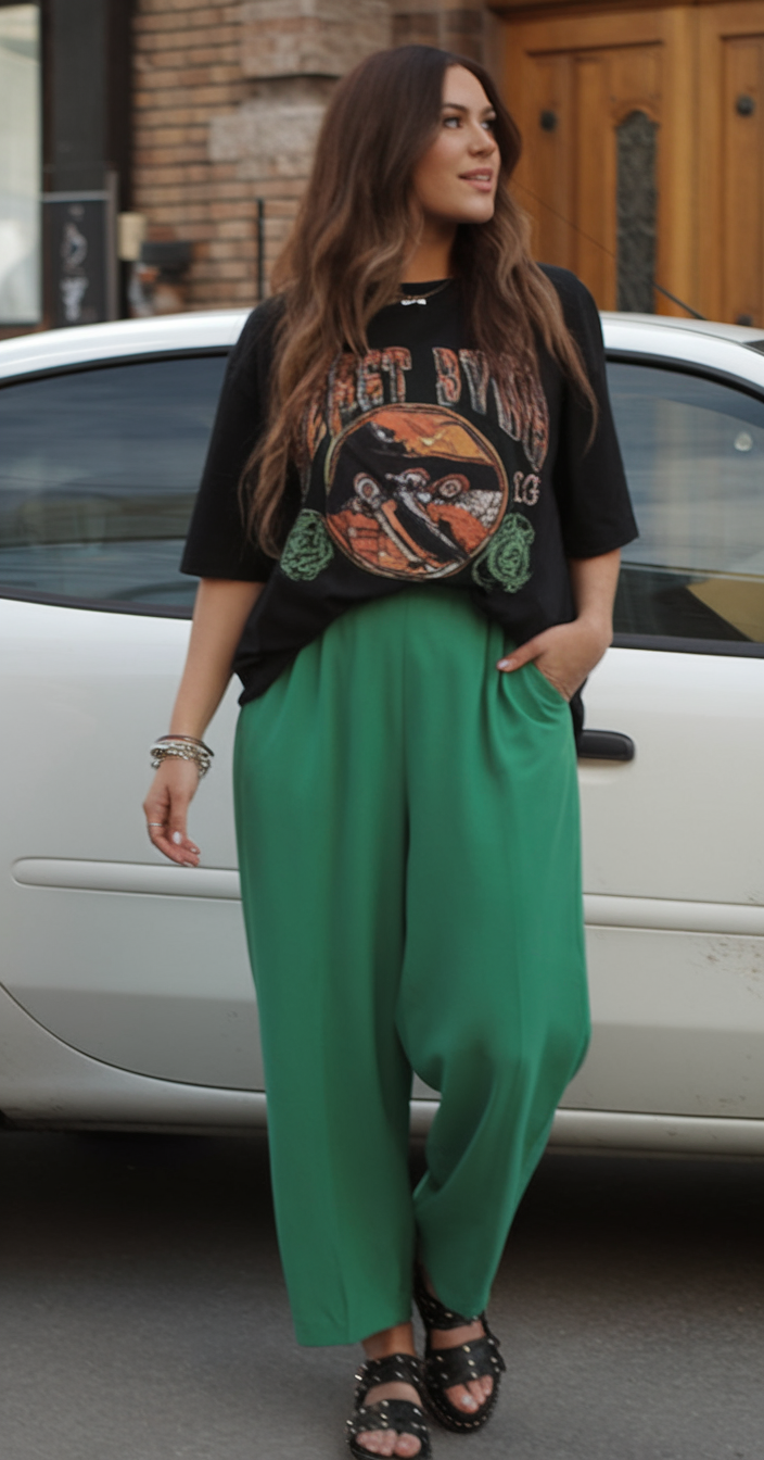 This casual outfit pairs a black oversized graphic tee with bright green wide-leg trousers for a bold casual street style look. The studded black sandals add an edgy element, while silver accessories enhance the relaxed vibe. Perfect for concerts or petite fashion spring styling.
