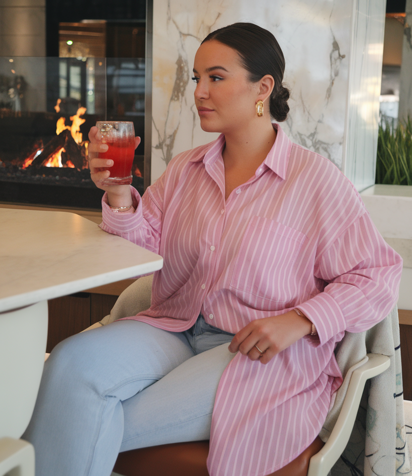 A relaxed oversized pink striped shirt with rolled-up sleeves and a loose fit brings a casual yet polished vibe. The light wash jeans balance the soft pastel tone with a simple, classic design. Perfect for a laid-back setting, this outfit pairs well with minimal gold accessories.