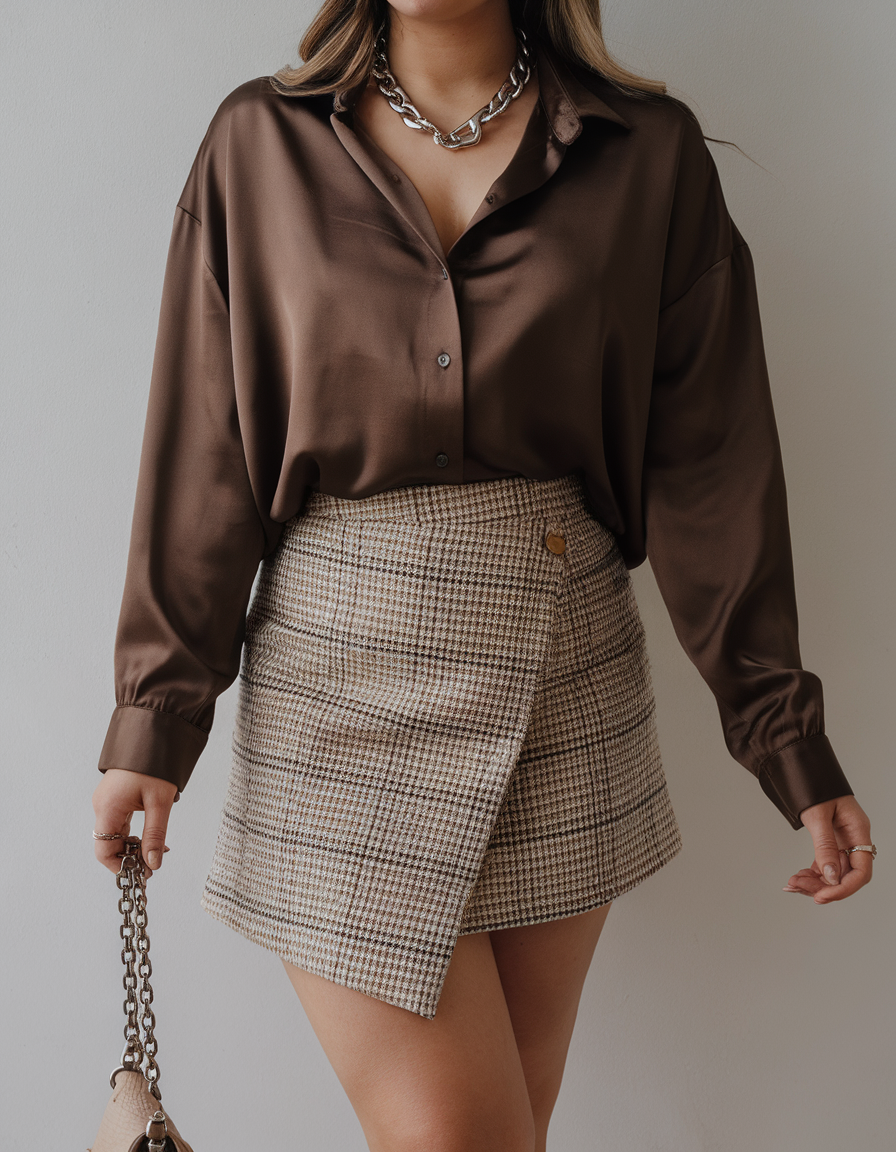 A rich chocolate satin shirt is tucked into a houndstooth wrap mini skirt, combining texture with timeless elegance. The skirt’s asymmetrical button detail adds a modern edge, while the satin top brings luxury to the outfit. Paired with a chunky silver chain necklace, it’s an effortlessly chic ensemble.