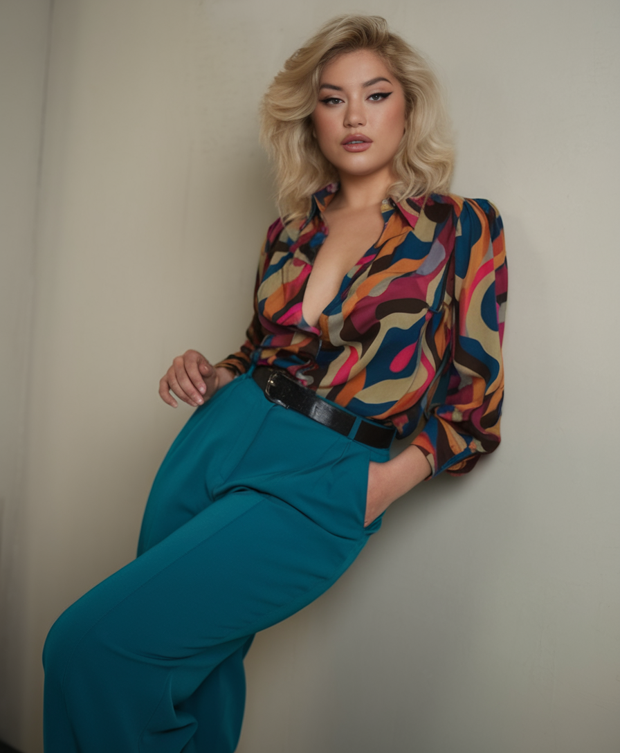 The blouse features a bold, retro-inspired multicolored pattern with earthy tones and vibrant pops of pink and blue. Its deep V-neckline and slightly puffed shoulders enhance its vintage charm. The high-waisted teal trousers are tailored with pleats, creating a structured yet relaxed silhouette, paired with a black belt featuring a statement silver buckle for a polished finish.