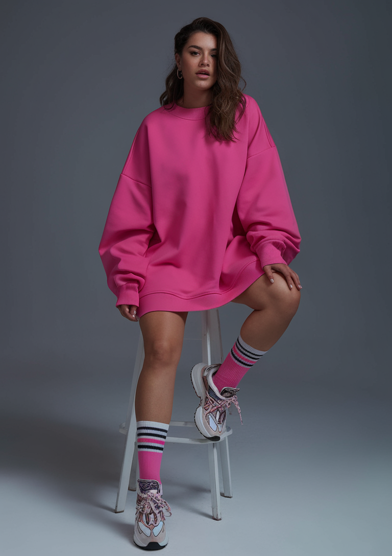 This oversized sweatshirt, in a striking hot pink hue, combines comfort and style with its dropped shoulders and ribbed cuffs. Paired with striped socks in matching tones and chunky athletic sneakers, the outfit leans into an athleisure vibe while making a bold color statement.