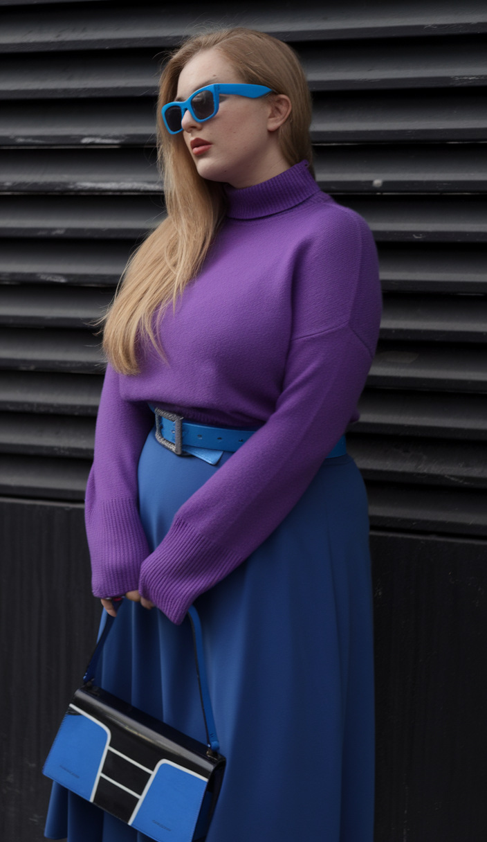 A vibrant purple turtleneck sweater with a relaxed fit is styled with a cobalt blue A-line midi skirt, creating a striking color-block effect. The outfit is accessorized with a matching blue belt and a structured handbag featuring black and white accents, adding a modern touch to the bold and sophisticated ensemble.