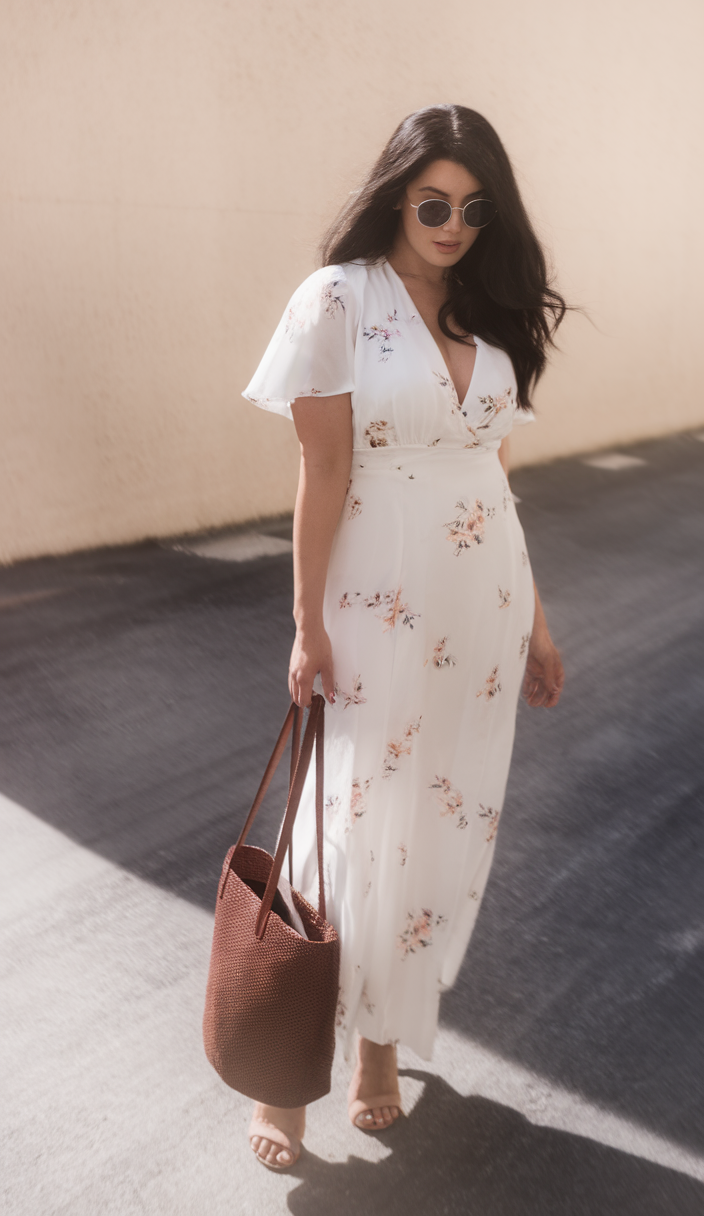 This white midi dress features puff sleeves and a button-front design that creates a feminine and flattering silhouette for thick body types. The lightweight fabric and subtle slit make it perfect for spring fashion or a relaxed graduation celebration. Paired with clear heels and minimal jewelry, this outfit is versatile for both formal and casual events.