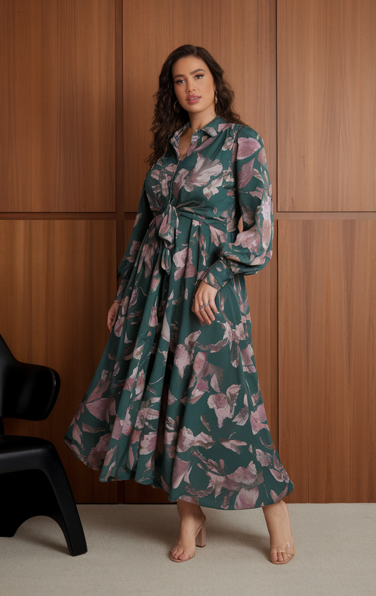 This maxi dress is crafted from a flowy green fabric with a bold floral print, ideal for spring curvy outfits ideas 2025. The shirt-style collar and waist tie offer structure, flattering thick and alt body types beautifully. Perfect for graduation or casual street style, it pairs effortlessly with nude heels for a polished finish.