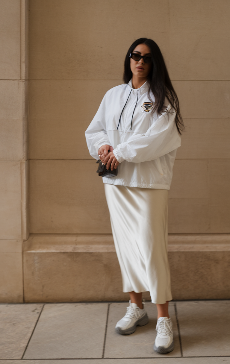 This look combines a sleek white satin midi skirt with an oversized sporty jacket, creating a chic goth-inspired spring fashion style. The contrast of textures adds depth, making it versatile for everyday wear or a concert. Completed with chunky sneakers, this outfit blends casual comfort with elevated style.