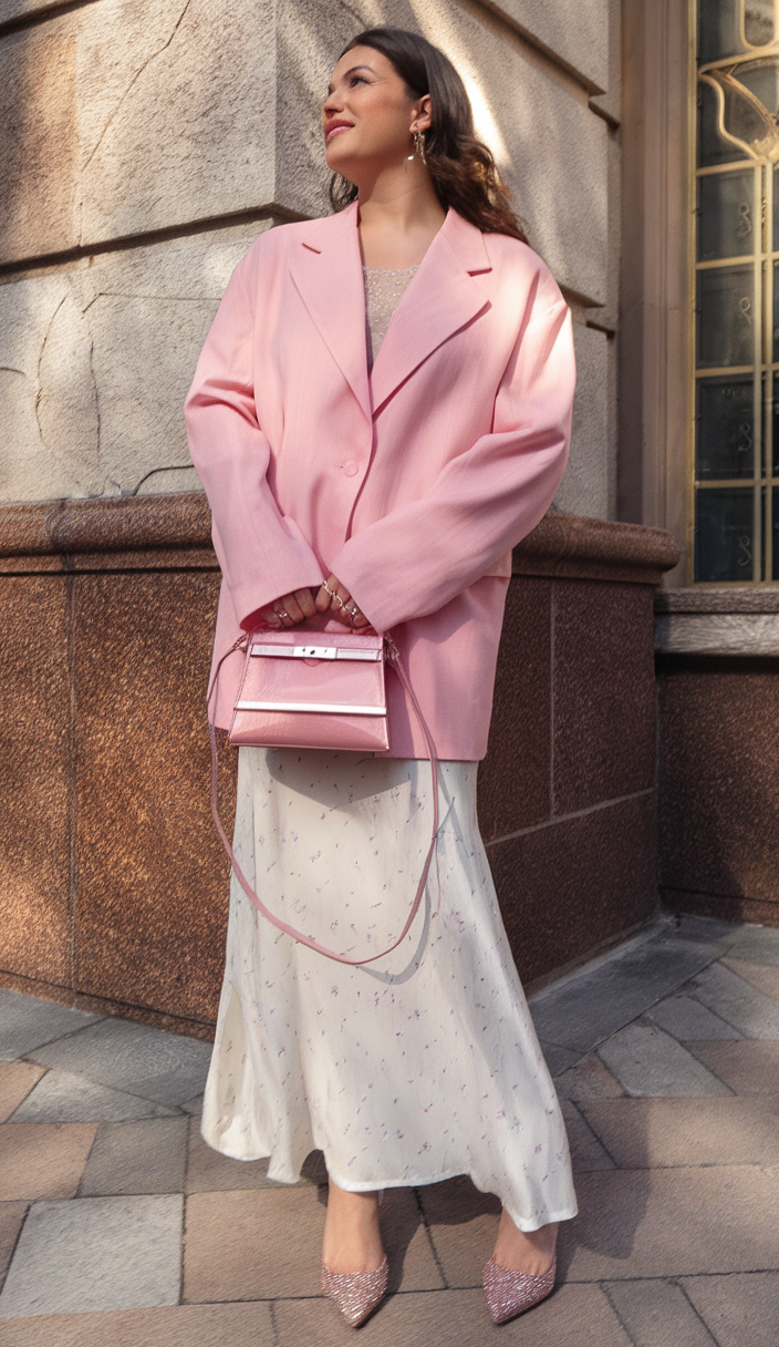 This outfit pairs an oversized pink blazer with a flowy white maxi dress adorned with subtle floral prints, creating a soft and feminine spring fashion look. The structured blazer balances the delicate dress, making it a stylish option for body types spring and casual street style. Completed with pink heels and a matching mini bag, this ensemble is perfect for everyday or may birthday celebrations.