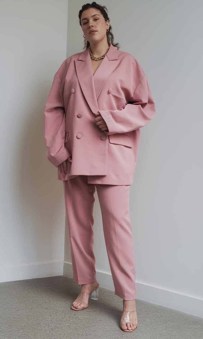 A chic monochromatic pink suit features an oversized double-breasted blazer paired with tailored trousers, ideal for de outfits formales. The structured yet relaxed fit enhances thick women while maintaining a polished, modern vibe. Styled with clear heels and gold jewelry, this look works well for graduation or alt body types in spring curvy outfits ideas 2025.