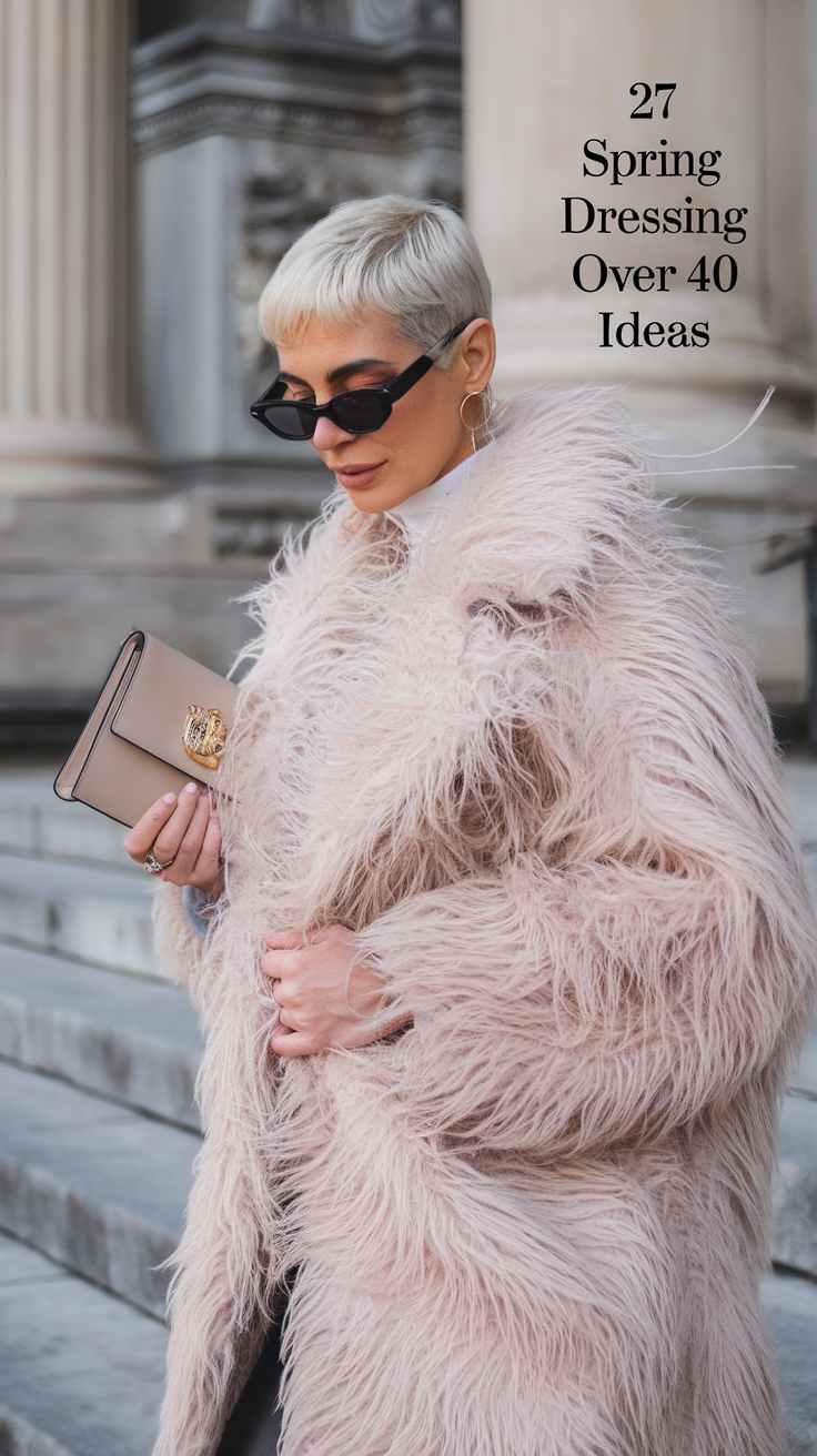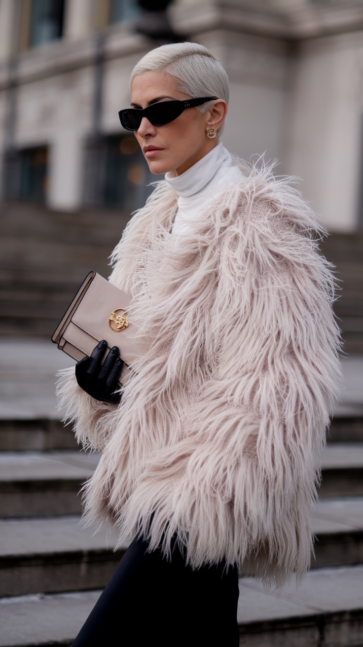 A statement shaggy faux fur coat in blush pink takes center stage, paired with a sleek white turtleneck for a polished base. Black gloves and oversized sunglasses add a touch of mystery and sophistication. The look is finished with a nude clutch featuring gold hardware, offering a subtle yet elegant contrast to the textured outerwear.
