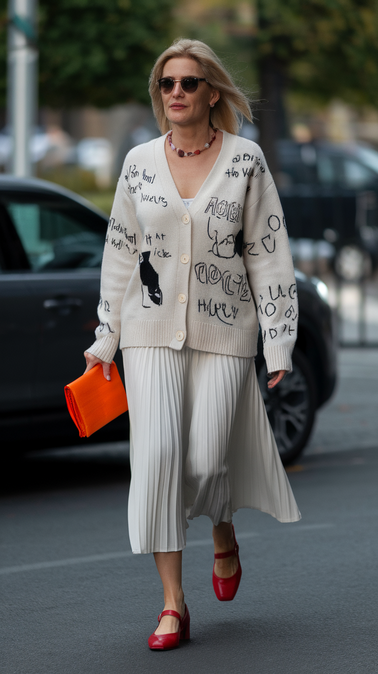 This outfit features a cream cardigan with playful graphic prints paired with a pleated midi skirt in matching tones. Red Mary Jane heels and an orange clutch add bold accents, bringing vibrancy to the neutral base. It’s a balanced choice for casual chic style that works for various spring occasions.
