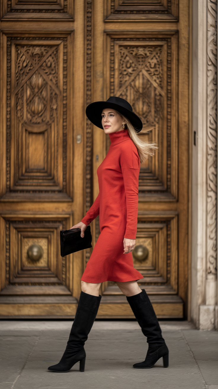 This outfit features a sleek red turtleneck midi dress paired with tall black suede boots, creating a striking contrast. A wide-brimmed black hat and a simple black clutch add elegance to the overall look. Perfect for fashion trends for women, this ensemble blends bold color with timeless accessories.