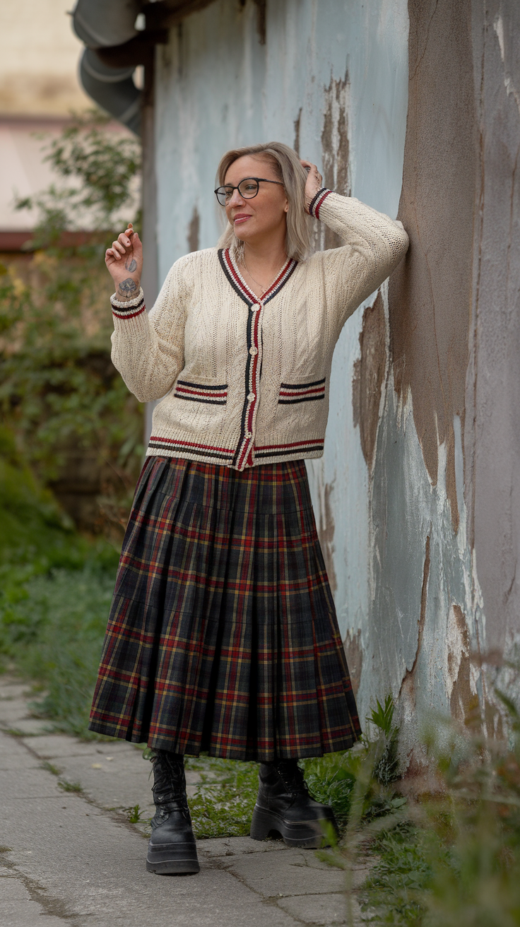 This casual outfit combines a cream-colored knitted cardigan with striped trim details and a classic pleated plaid skirt. Chunky black lace-up boots add a modern edge to the otherwise vintage-inspired look. This outfit embodies casual fashion ideas with a mix of cozy textures and patterns.