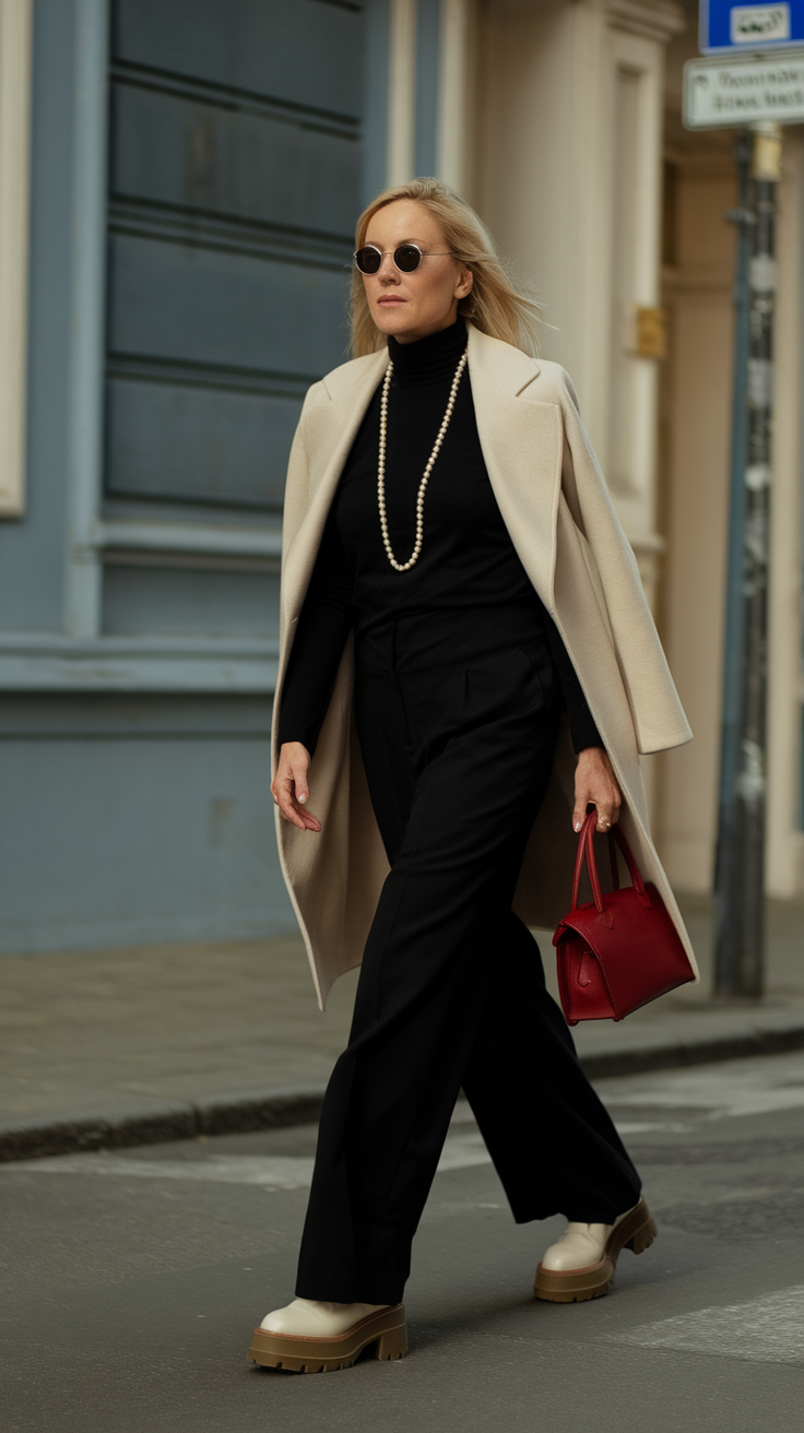 This look features a tailored beige coat draped over a sleek all-black ensemble, including a turtleneck and wide-leg trousers. Chunky off-white loafers and a red structured handbag bring contrast and depth to the minimalist palette. It’s a refined take on outfit ideas for women that balances modern and classic elements.