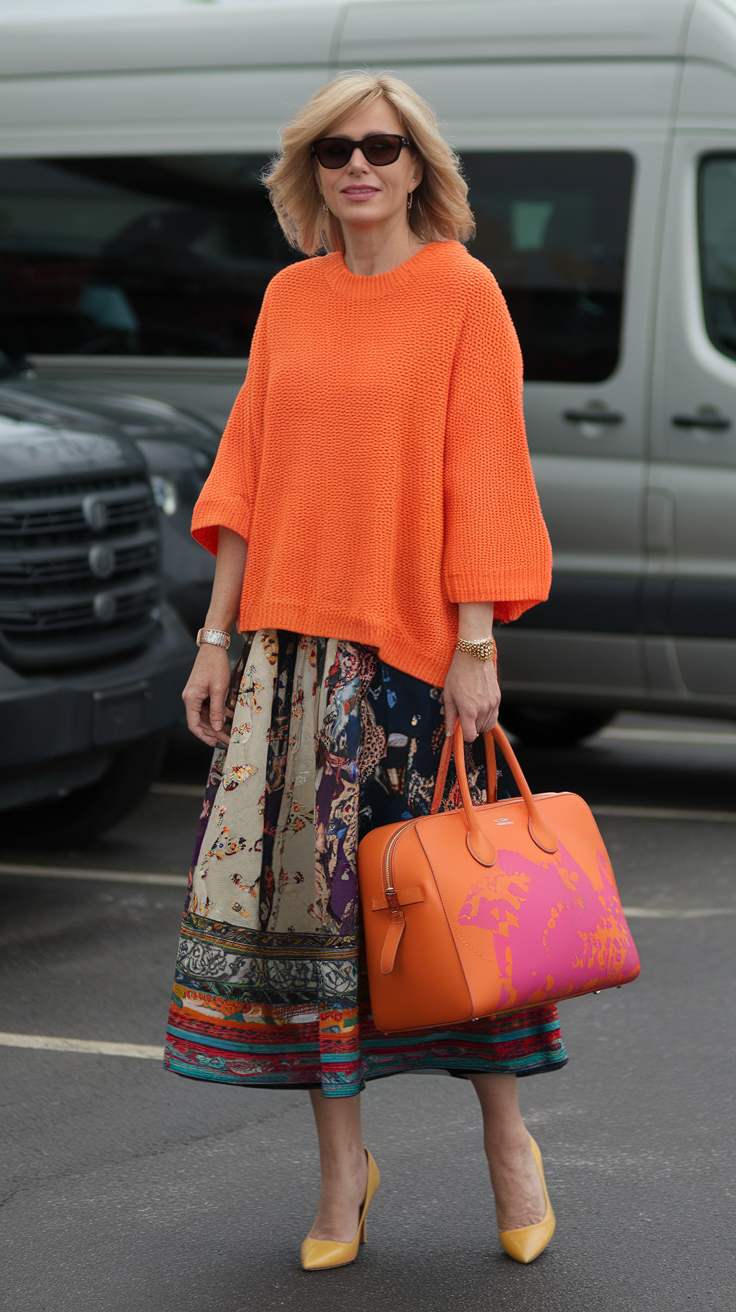 This ensemble features a bold orange oversized knit sweater paired with a colorful patterned maxi skirt. Yellow heels and an orange tote bag with pink accents add cohesiveness to the vibrant palette. This is a striking example of fashion trends for women embracing bold colors and prints.