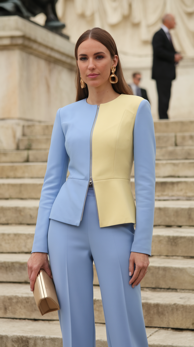 This outfit features a tailored two-tone blazer in soft blue and yellow with a sleek zippered closure. The matching blue wide-leg trousers create a polished monochromatic effect, while a metallic clutch and statement gold earrings add elegance. This sophisticated ensemble perfectly reflects outfits 2025 trends women.