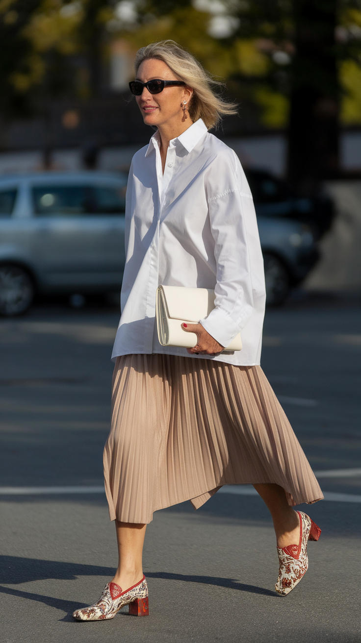 A classic white button-down shirt is styled with a flowing beige pleated midi skirt for a chic, minimalist look. Embellished heeled loafers in a red and cream pattern, paired with a white clutch, introduce subtle yet stylish accents. This combination highlights outfits for women blending simplicity with standout footwear.