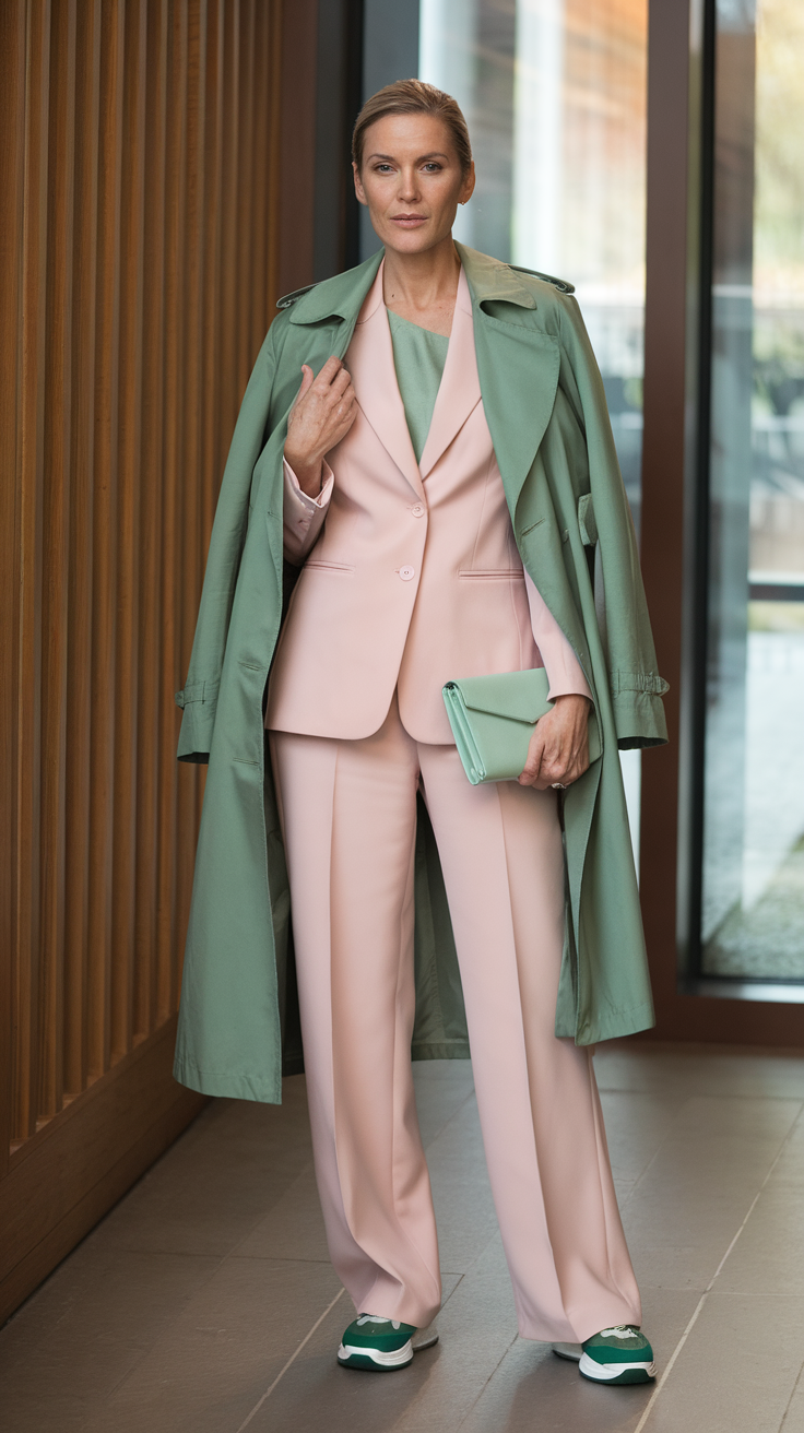 A pastel pink tailored suit is styled with a mint blouse, creating a soft and sophisticated ensemble. The look is elevated with a mint trench coat and matching clutch, while green sneakers add a relaxed touch. This modern approach to tailoring reflects the versatility of outfits 2025 trends women.