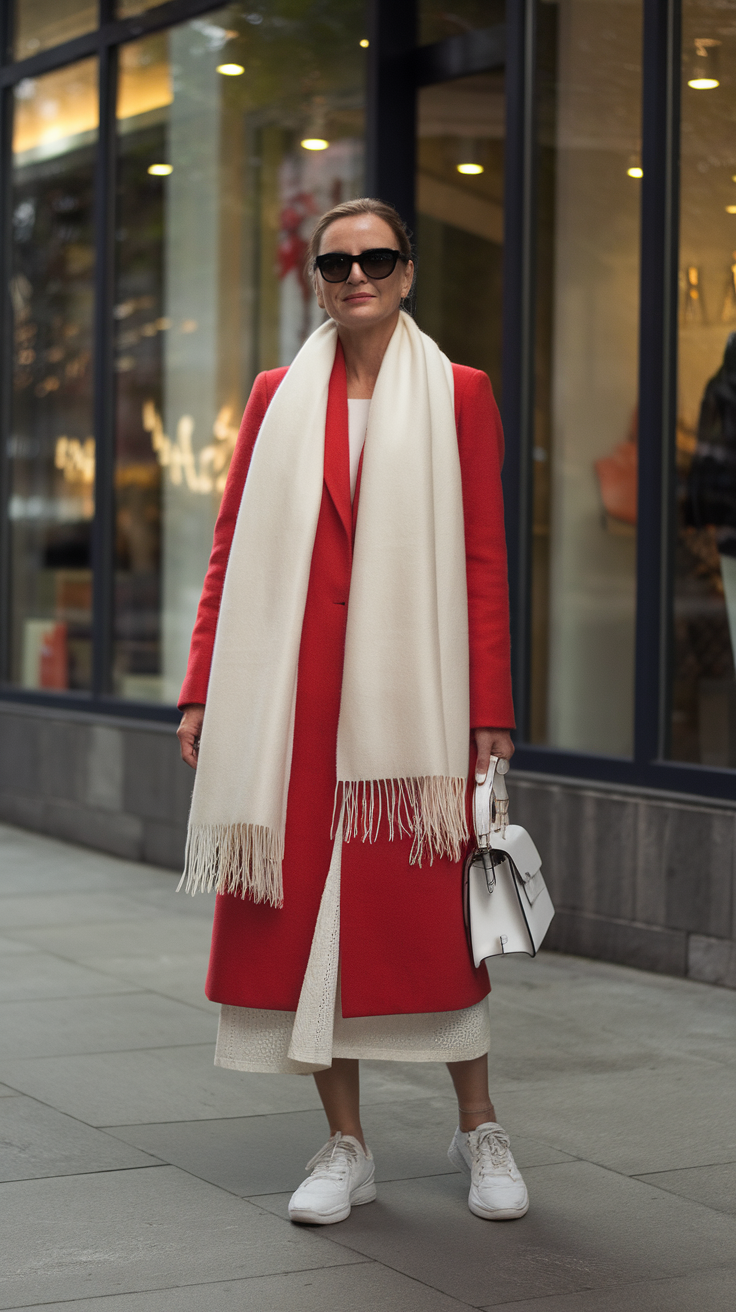 The outfit features a bold red coat paired with a long white knit dress, layered underneath for a soft contrast. A large ivory scarf with delicate fringe detailing adds warmth and texture to the look. The ensemble is completed with white sneakers and a structured white handbag for a modern, casual touch.