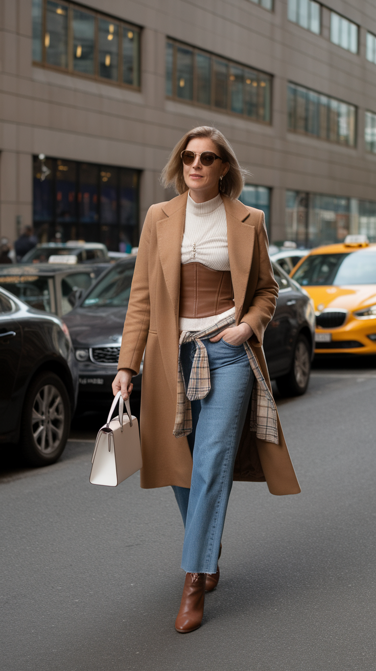 A camel wool coat is layered over a ribbed cream turtleneck, paired with a brown leather corset belt that cinches the waist for a structured silhouette. Light blue straight-leg jeans add a casual element, complemented by a plaid shirt tied around the waist for an effortlessly chic vibe. Accessories include brown ankle boots and a white leather handbag, balancing the earthy tones.