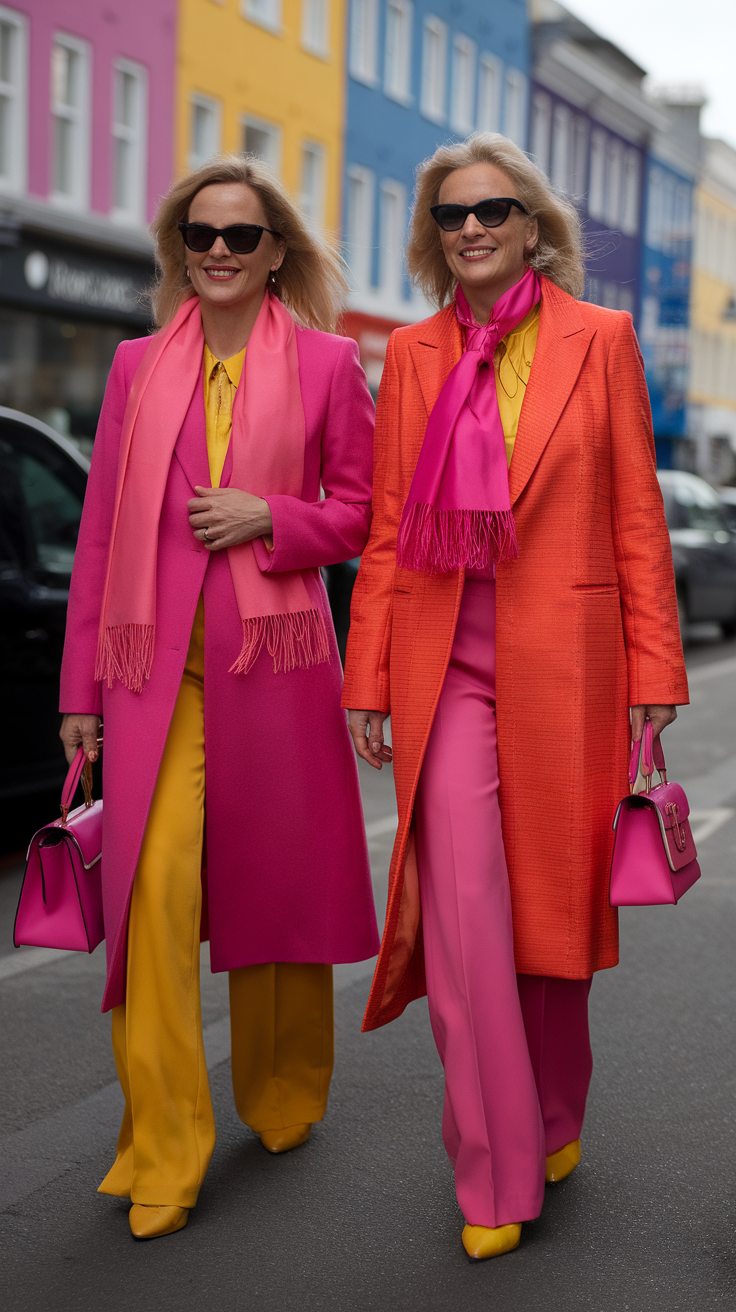 This bold look pairs a bright pink coat with orange and yellow trousers for a dynamic color-blocked statement. Matching bags and pointed heels create a polished, cohesive appearance while maintaining a playful vibe. It’s a standout outfit idea for women embracing daring color combinations.