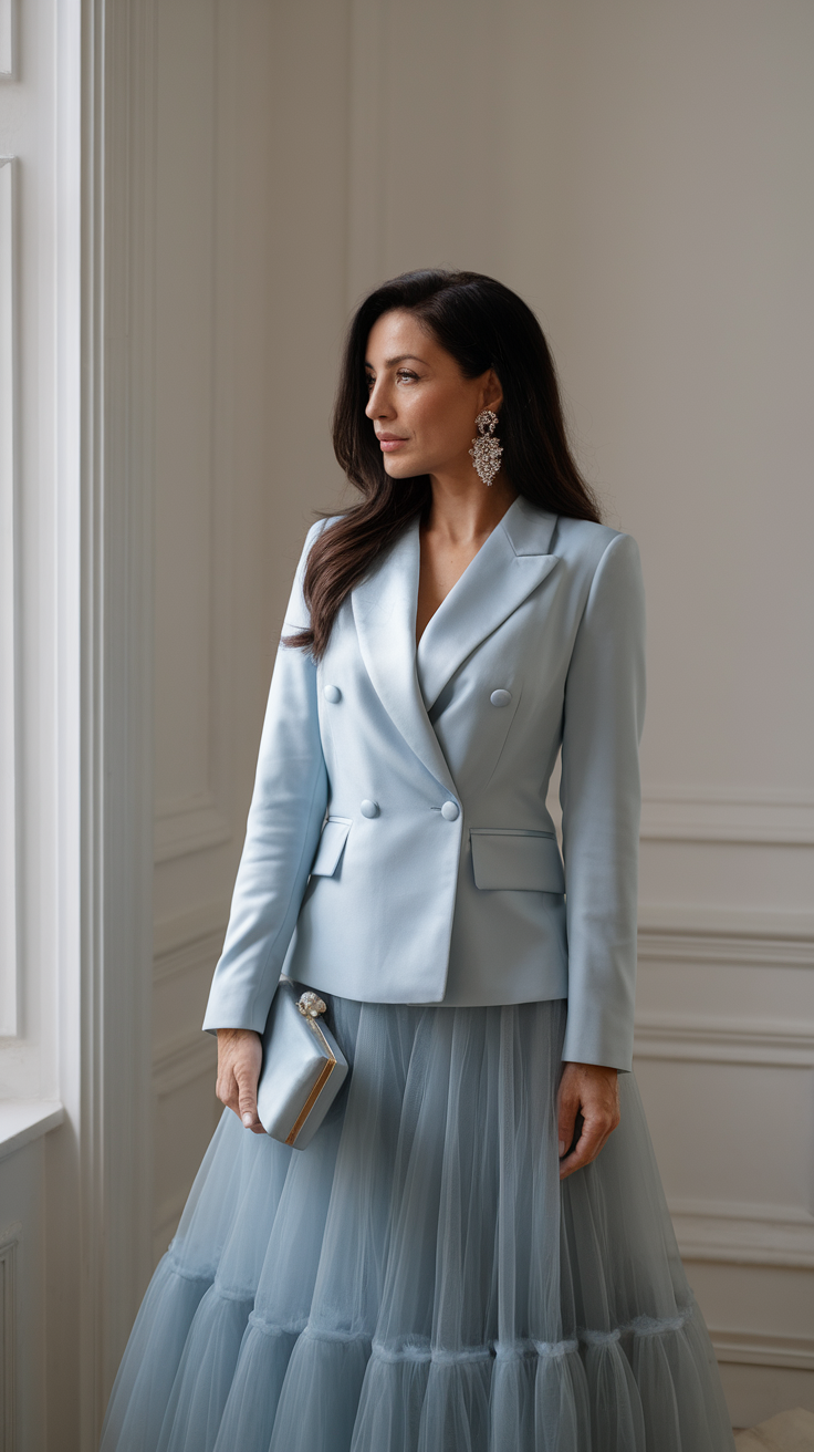 This elegant outfit features a tailored powder blue double-breasted blazer with structured shoulders. It is paired with a voluminous tulle skirt in the same hue, creating a soft, monochromatic look. A delicate clutch and statement earrings complete this refined take on spring dressing over 40 ideas 2025.